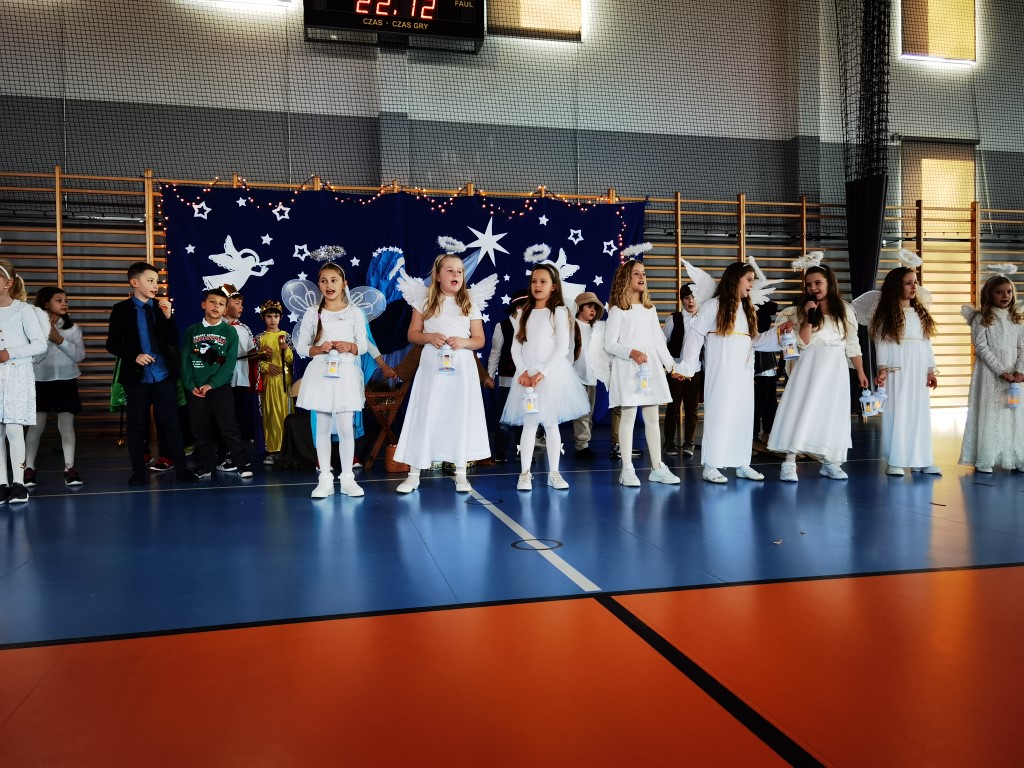 To nie tylko tytuł kolędy, lecz myśl przewodnia całego dnia – 22 grudnia w naszej szkole. Jak co roku o tej porze odbyły się jasełka, przygotowane przez uczniów klas drugich pod opieką nauczycieli. Pierwsze przedstawienie było dedykowane uczniom z klas 1 – 3 a następnie zostało ono wystawione klasom 4 – 8. Na wstępie Ksiądz Krzysztof Kula zachęcił do obejrzenia jasełek, prosząc o zwrócenie uwagi na to, co jest przyczyną i sensem świętowania Bożego Narodzenia.