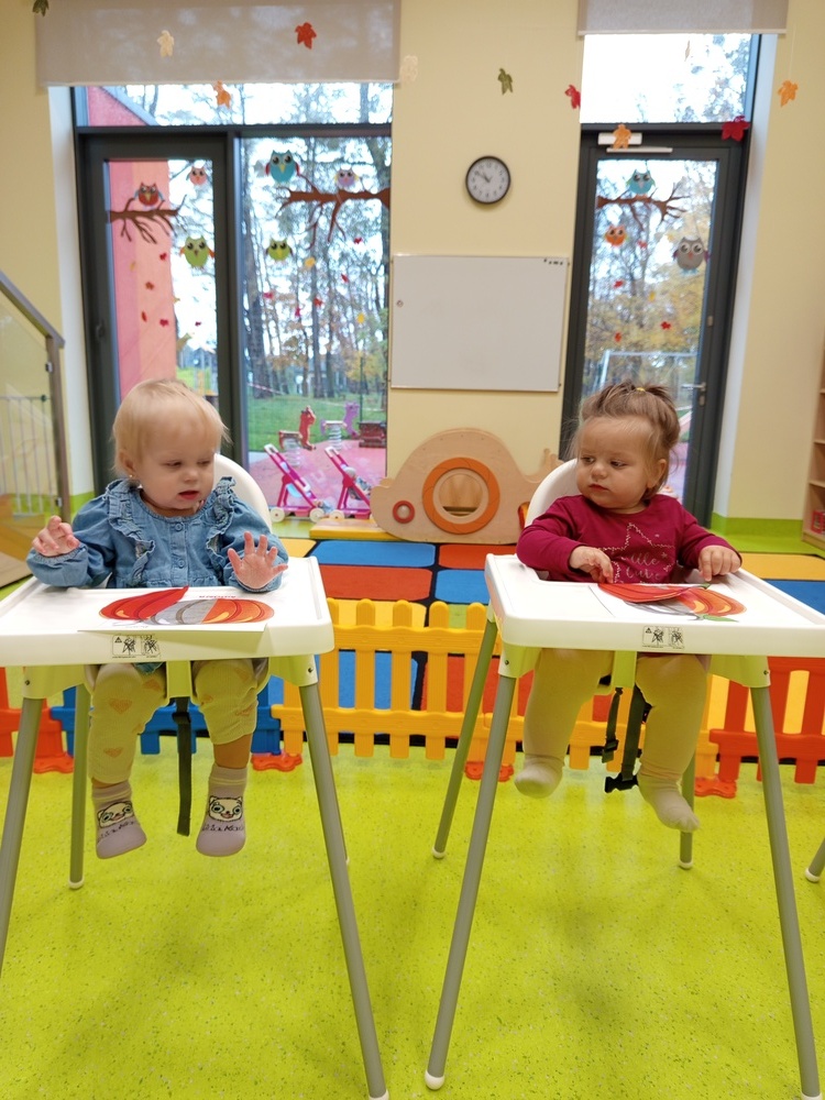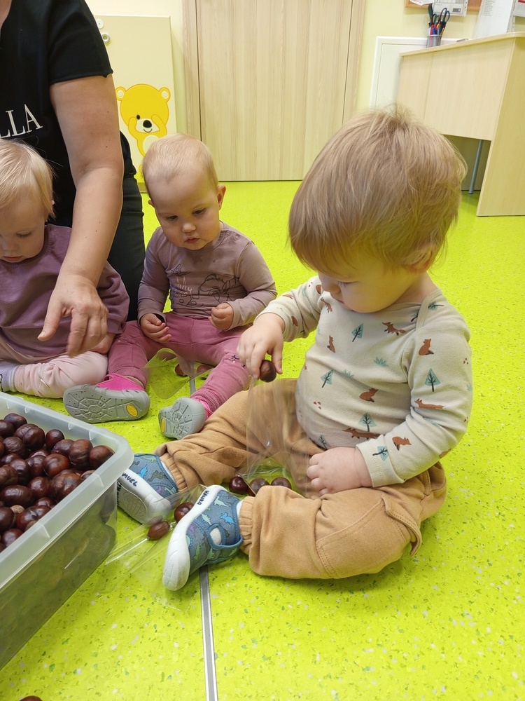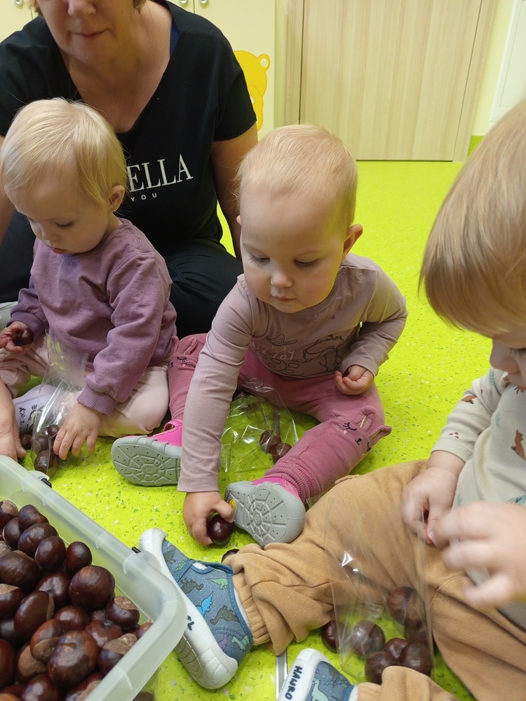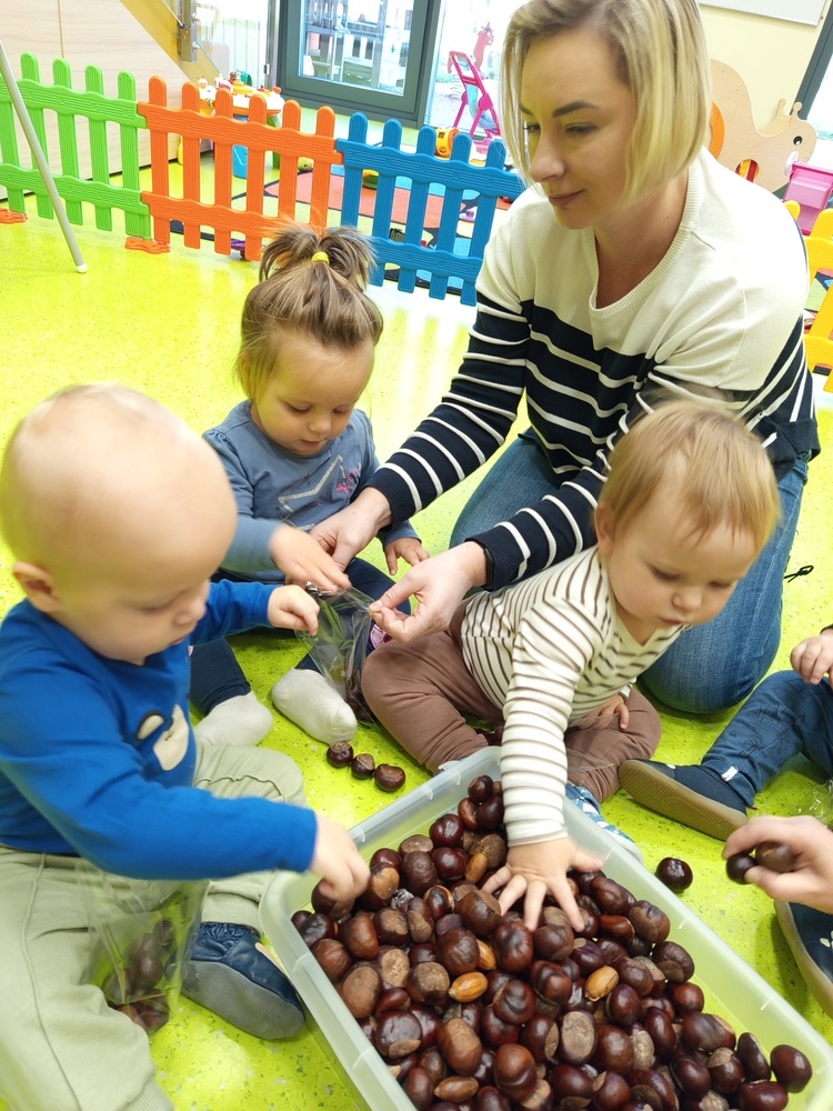 Śmiało wkładały do woreczków kasztany, ćwicząc w ten sposób chwyt. Później wspólnie naklejaliśmy oczy, dzioby i skrzydełka.