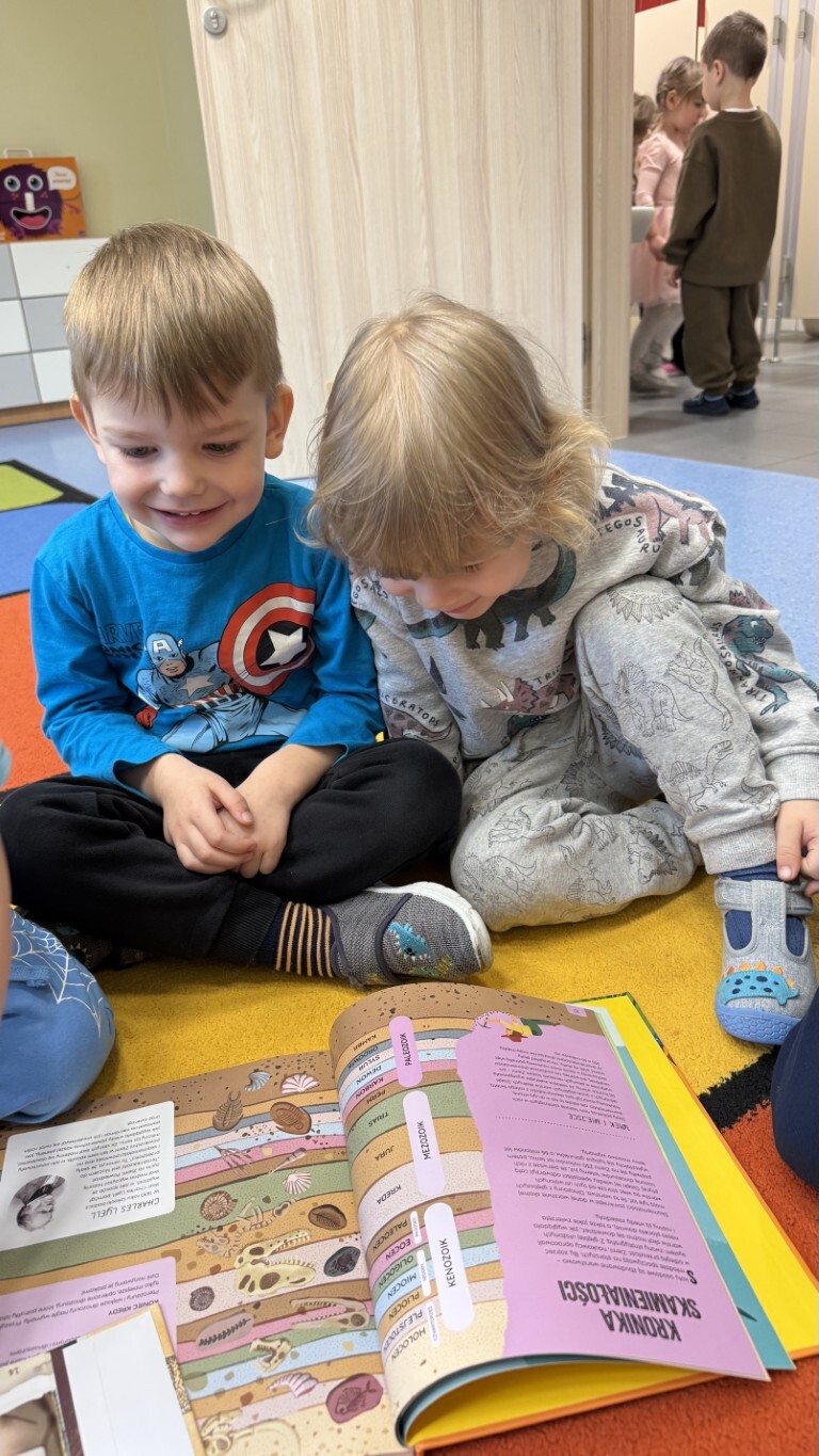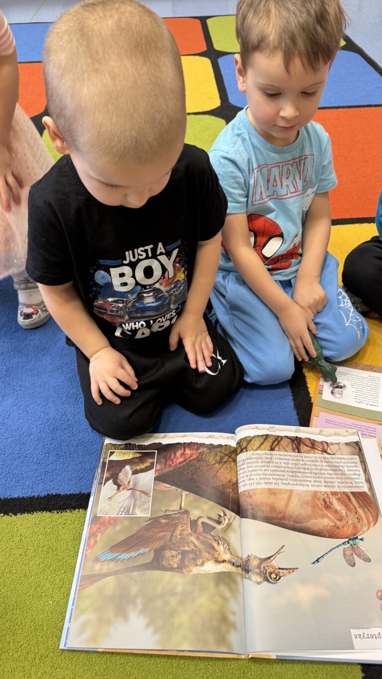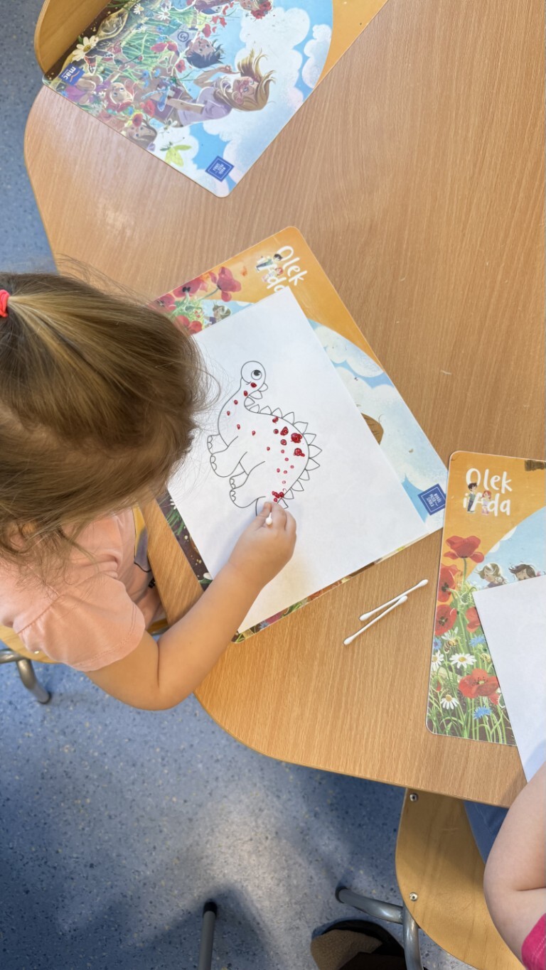 Dzieci malowały kolorowe dinozaury, rozwijając swoją wyobraźnię i zdolności plastyczne. Wspólnie czytaliśmy bajkę o prehistorycznych gadach oraz oglądaliśmy książkę przedstawiającą różne gatunki dinozaurów.