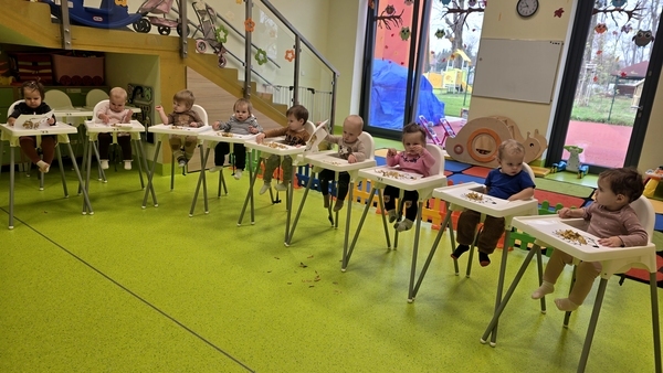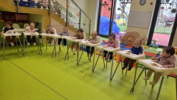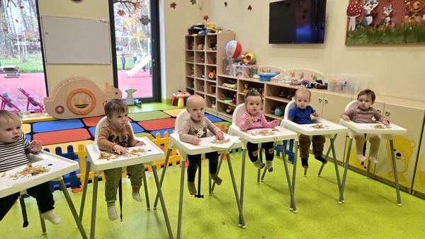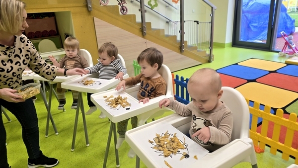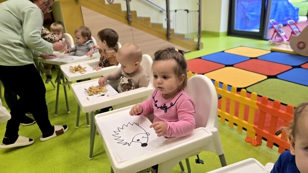 Krasnale słuchały piosenki o jeżu i przyklejały kolorowymi liśćmi kontur zwierzaka.