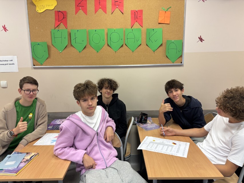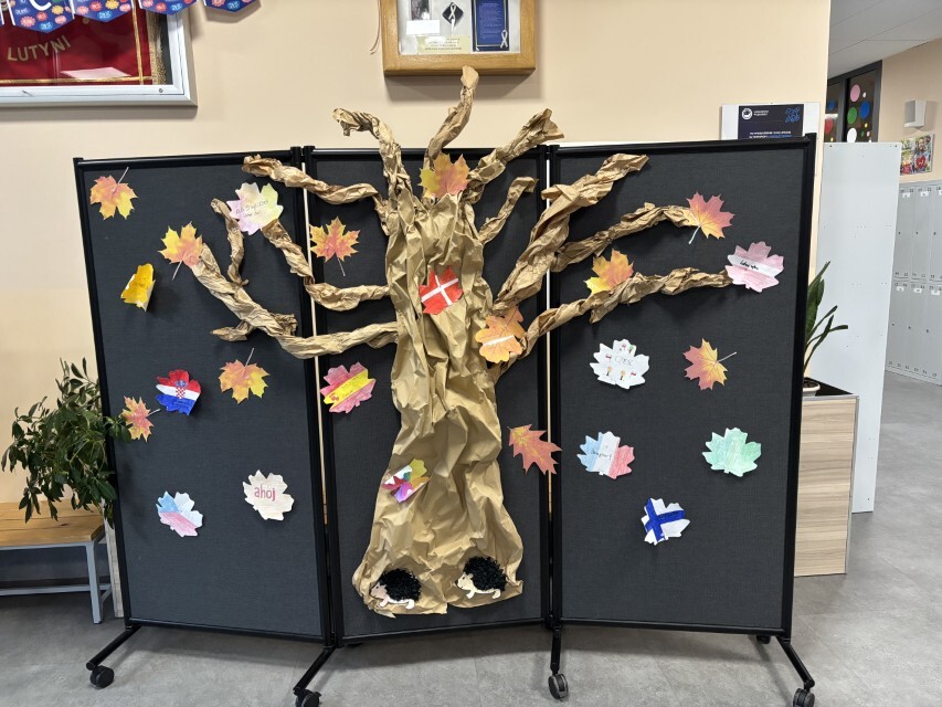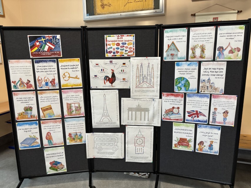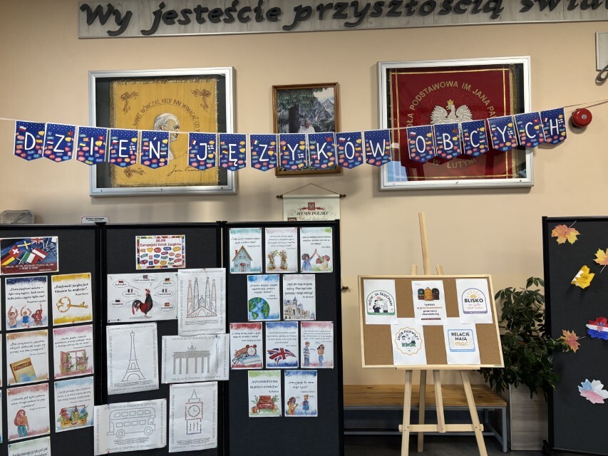 26 września 2025 roku obchodziliśmy Europejski Dzień Języków Obcych. Jest to coroczne święto ustanowione przez Radę Europy, które ma na celu promowanie nauki języków obcych. Nauczyciele języków obcych z naszej szkoły również starają się zwrócić uwagę swoim uczniom na korzyści płynące z nauki języków obcych. Z tej okazji, w holu głównym widoczny był napis Dzień Języków Obcych, a w jego otoczeniu nie sposób było nie zauważyć kolorowych flag państwowych w formie liści, symbolizujących otwartość na inne kultury, szacunek i tolerancję. Każda klasa miała za zadanie zapisać na liściu przywitanie w dowolnym języku państwa europejskiego. Dekoracja w postaci drzewa została przygotowana przy współpracy ze świetlicą szkolną. W tym dniu, lekcje języków obcych nie wyglądały standardowo. Na lekcjach języka angielskiego i niemieckiego klasy 4-8 realizowały projekt edukacyjny, którego celem było kształtowanie postawy otwartości i ciekawości wobec innych kultur i narodów, rozbudzanie motywacji do nauki języków obcych oraz podkreślenie znaczenia wielojęzyczności w życiu codziennym i przyszłości zawodowej.