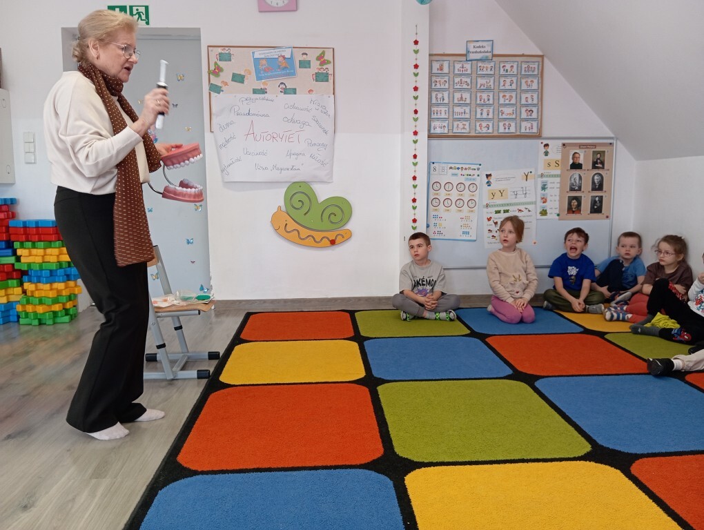 Odwiedziła nas Pani Teresa – pielęgniarka szkolna. Pokazała dzieciom jak prawidłowo myć zęby i jak ważna jest higiena. Wiemy już jakie mamy zęby oraz ile ich jest. Dzieci dowiedziały się również co należy jeść, a czego lepiej unikać chcąc mieć zdrowy uśmiech.