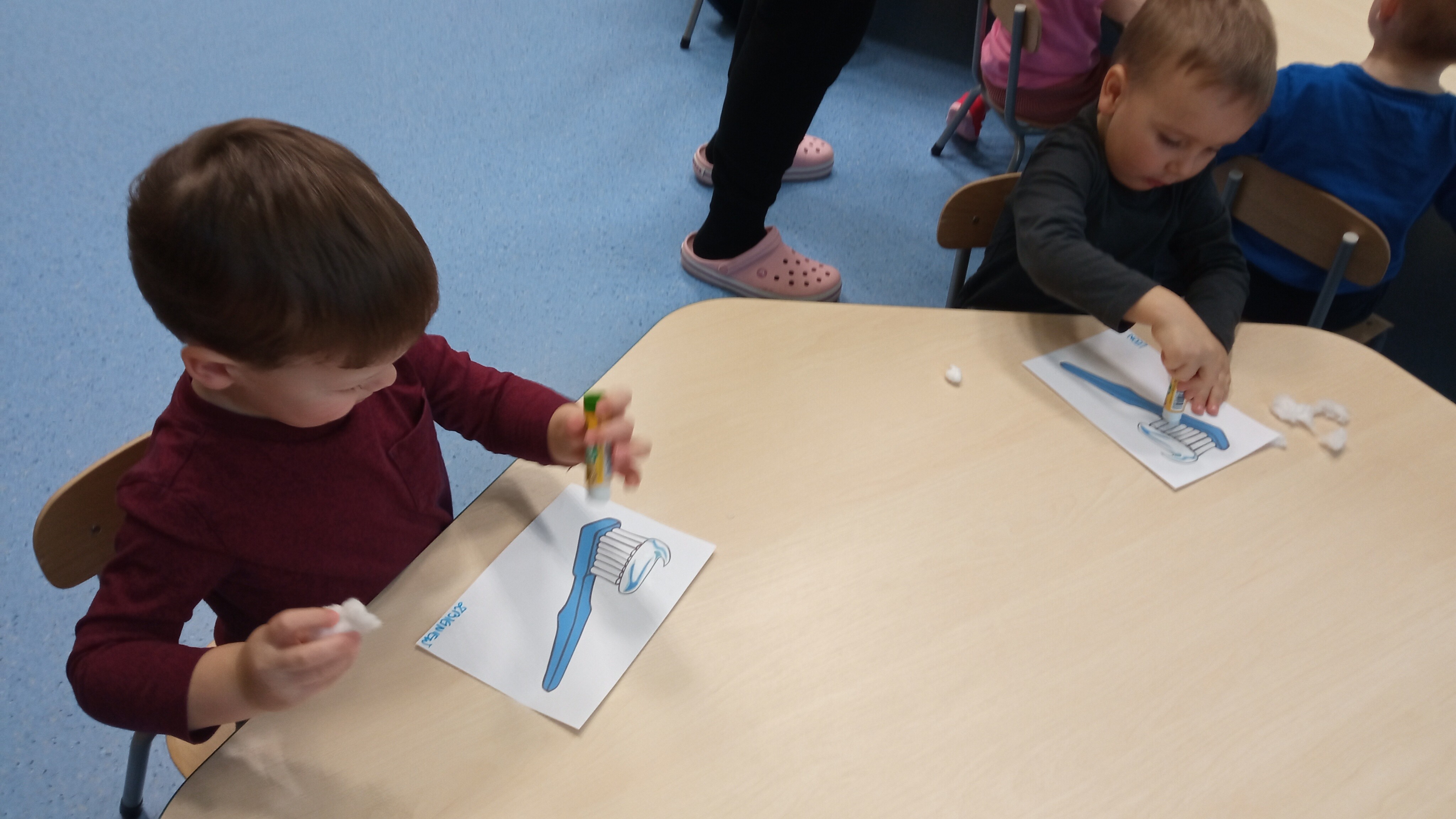 Oczywiście nie obyło się bez pracy plastycznej. Każdy wykonał indywidualnie swoja szczoteczkę z pastą ,a na zakończenie zajęć wykonaliśmy wspólnie gigantyczną jamę ustną z zębami z wytłaczanek po jajkach.