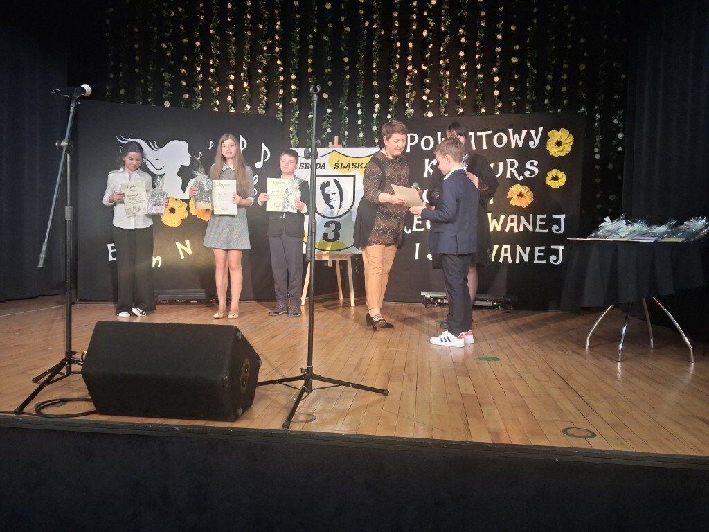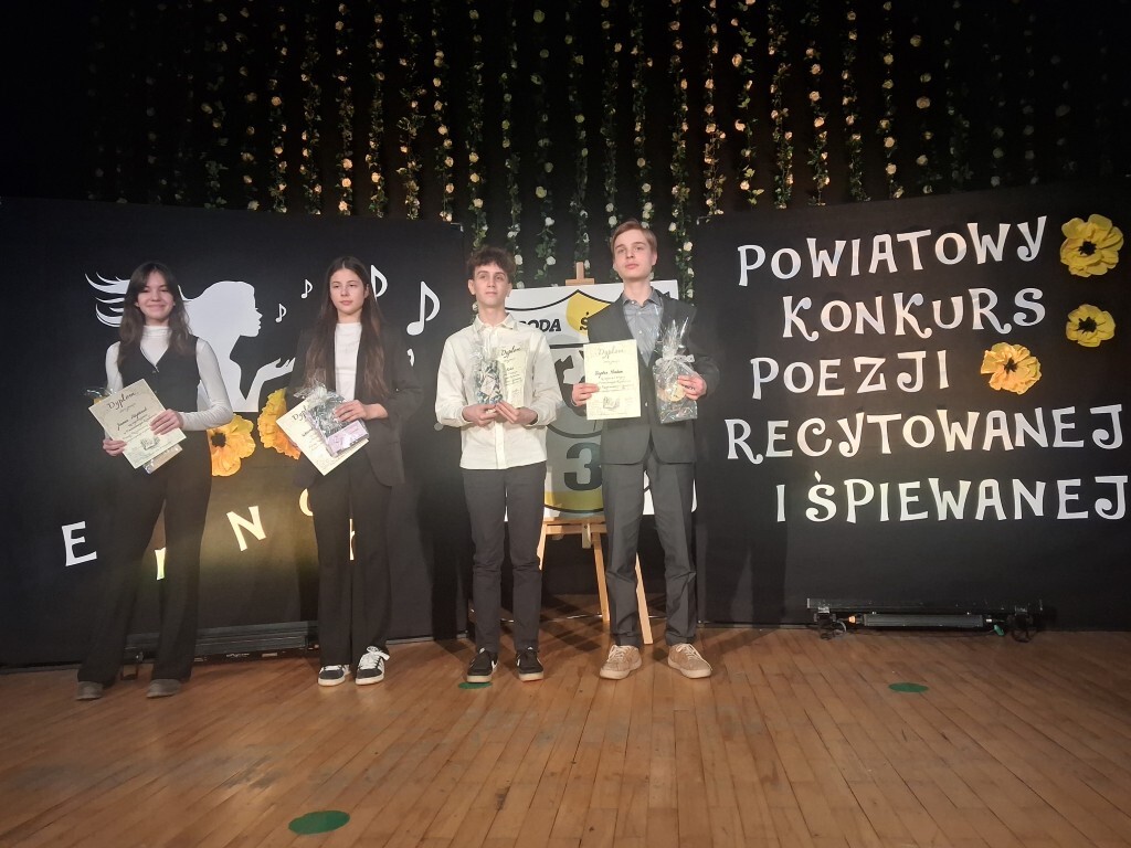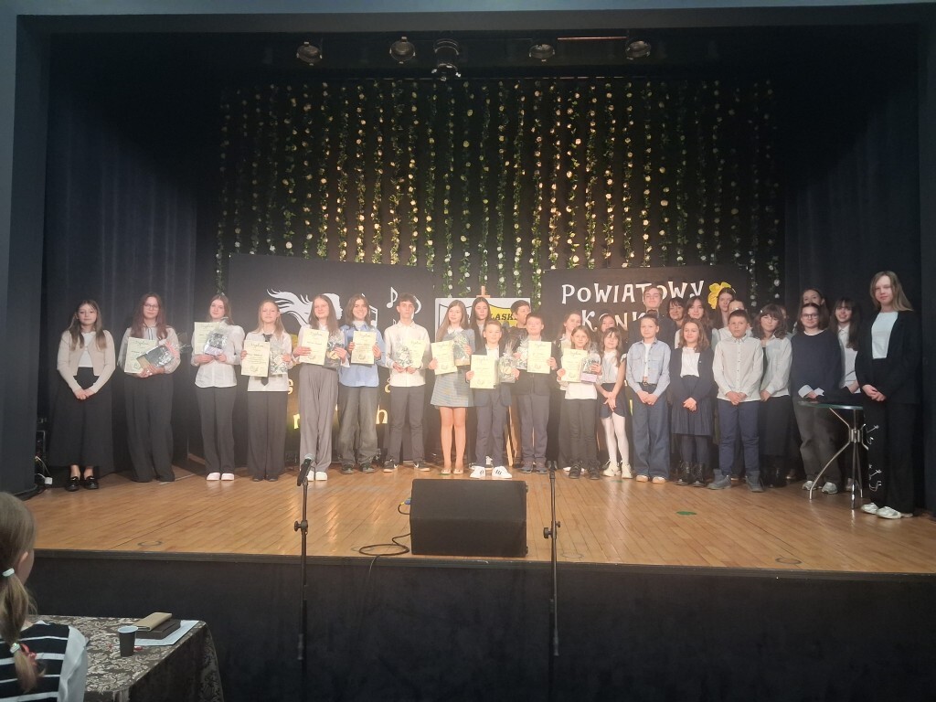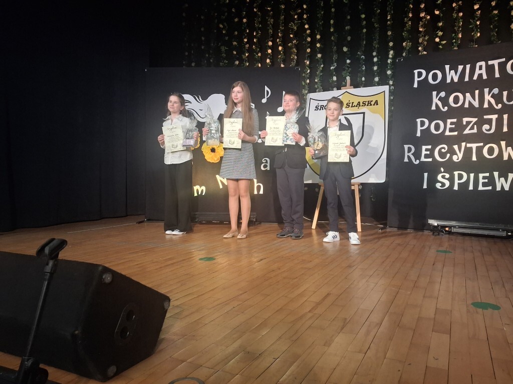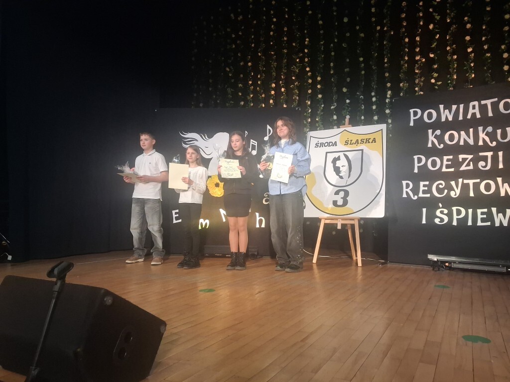 Dnia 16 marca zakwalifikowani uczniowie naszej szkoły udali się do Domu Kultury w Środzie Śląskiej, gdzie odbył się Powiatowy Konkurs Poezji Recytowanej i Śpiewanej. W gronie tym znaleźli się: Wojciech Jankowski (4 B), Lena Bagińska (5 C), Wiwianna Struk (5 D), Zuzanna Dębska (6 A), Patryk Leja (6B), Maja Iwanicka (6C), Agata Cholewa, Maja Kalbarczyk, Justyna Wolska (7 B), Olena Riabchenko (8A), Joanna Majchrzak, Kajetan Nuzban (8 B).