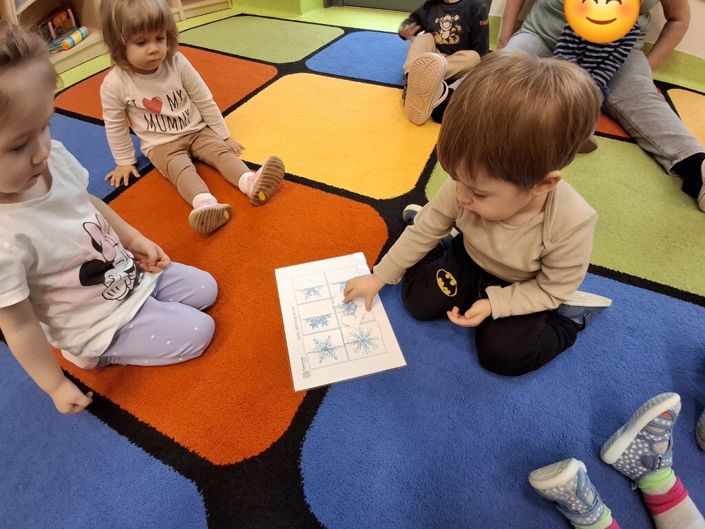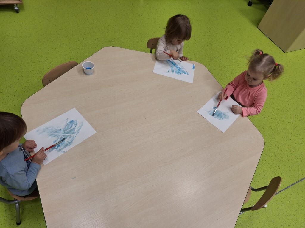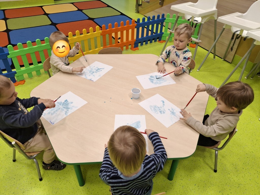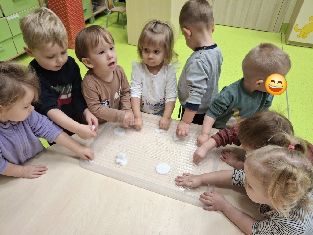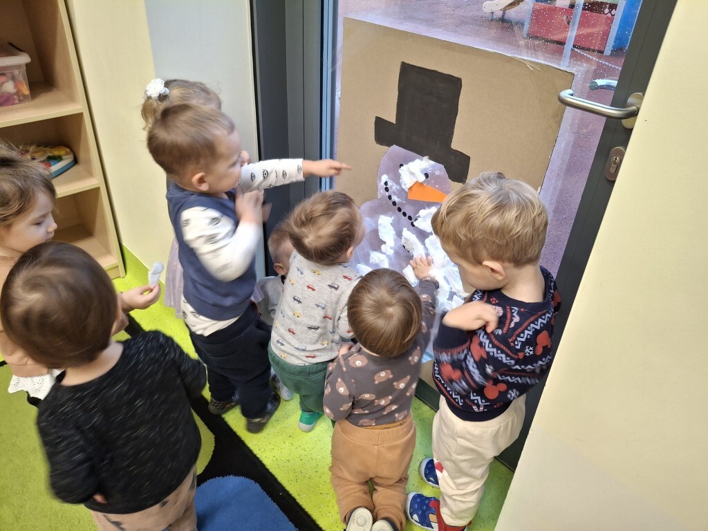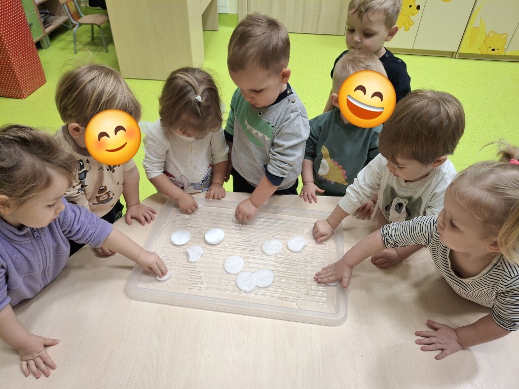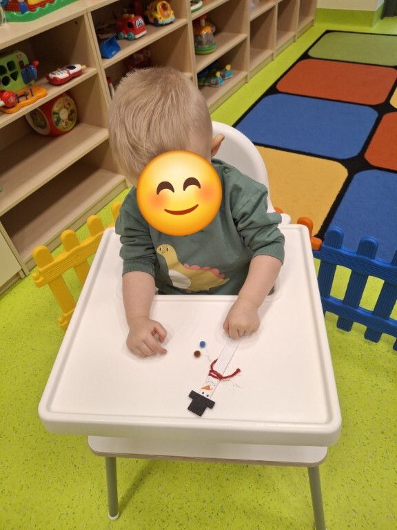 Już za kilka dni pożegnamy jesień i przywitamy zimę. W związku z tym, w grupie Kotków rozmawialiśmy o tym jak zmieni się krajobraz i co możemy robić na dworze, kiedy spadnie śnieg. Dzieci bezbłędnie odpowiedziały, że możemy ulepić bałwanka i korzystać z uroków zimy, jeżdżąc np. na sankach. Z racji tego, że na dworze nie było śniegu, próbowaliśmy „poczuć śnieg” bawiąc się wacikami kosmetycznymi zanurzonymi w wodzie. Przy pomocy niebieskiej farbki Kotki „wyczarowały śnieżynkę” oraz przykleiły guziczki, z pomponów, bałwankowi. Wspólnie, dzieci wypełniły postać bałwana kawałkami waty, które wcześniej szukały w sali. W omawianym tygodniu odbyły się również zajęcia rytmiki podczas których, między innymi, przy pomocy Gumy Sensorycznej, śpiewaliśmy i pokazywaliśmy piosenkę o koniku. Zajęcia z panią Lidką to zawsze pół godziny świetnej zabawy.