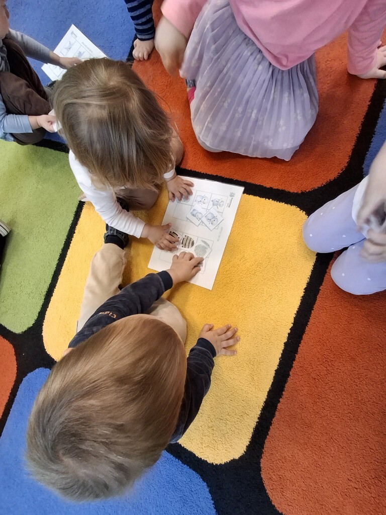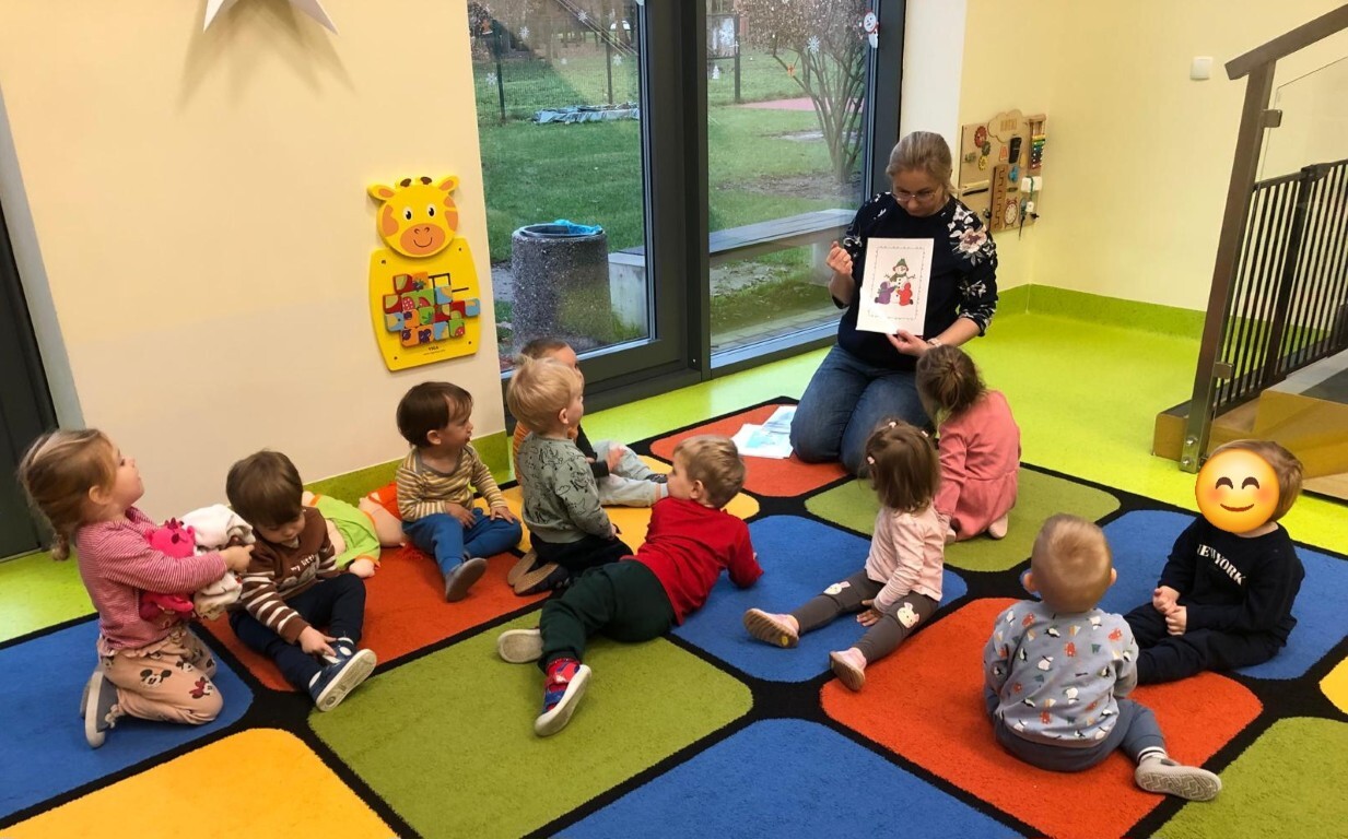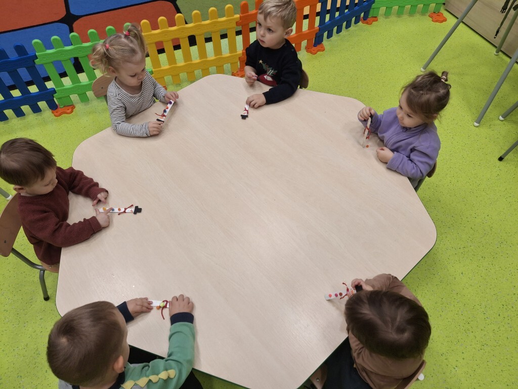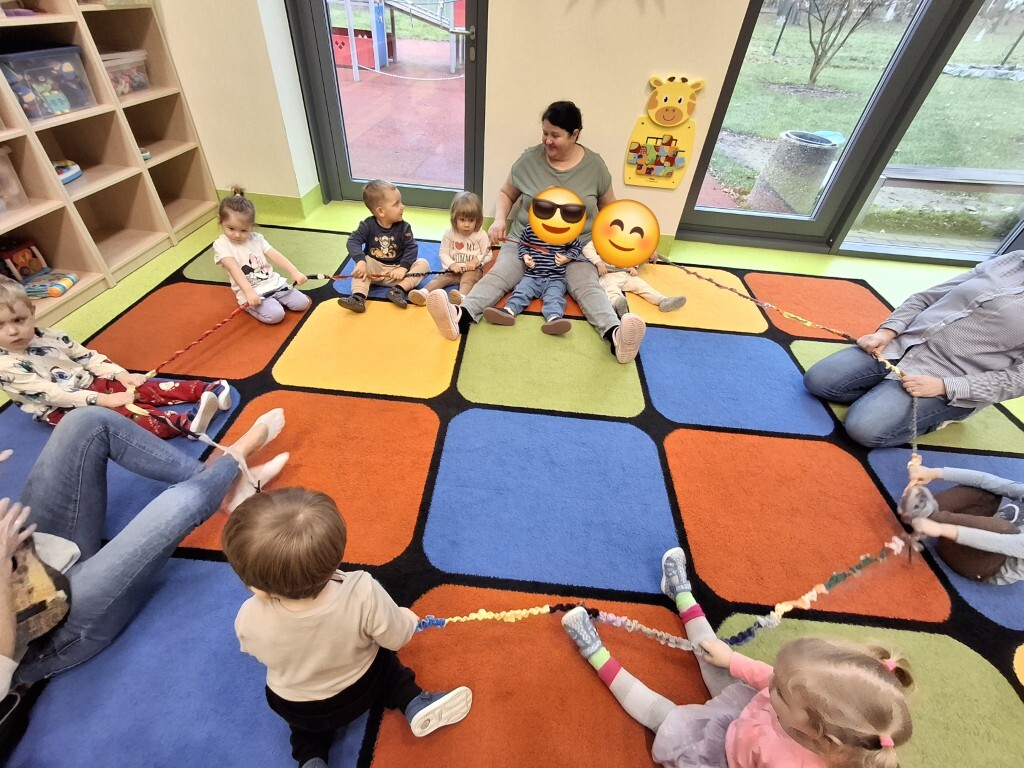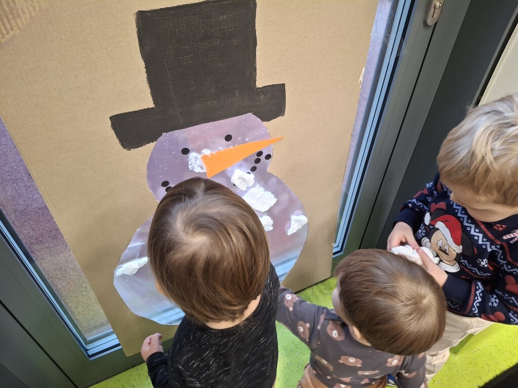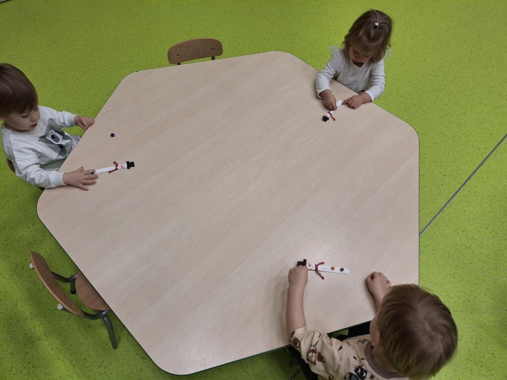 Już za kilka dni pożegnamy jesień i przywitamy zimę. W związku z tym, w grupie Kotków rozmawialiśmy o tym jak zmieni się krajobraz i co możemy robić na dworze, kiedy spadnie śnieg. Dzieci bezbłędnie odpowiedziały, że możemy ulepić bałwanka i korzystać z uroków zimy, jeżdżąc np. na sankach. Z racji tego, że na dworze nie było śniegu, próbowaliśmy „poczuć śnieg” bawiąc się wacikami kosmetycznymi zanurzonymi w wodzie. Przy pomocy niebieskiej farbki Kotki „wyczarowały śnieżynkę” oraz przykleiły guziczki, z pomponów, bałwankowi. Wspólnie, dzieci wypełniły postać bałwana kawałkami waty, które wcześniej szukały w sali. W omawianym tygodniu odbyły się również zajęcia rytmiki podczas których, między innymi, przy pomocy Gumy Sensorycznej, śpiewaliśmy i pokazywaliśmy piosenkę o koniku. Zajęcia z panią Lidką to zawsze pół godziny świetnej zabawy.