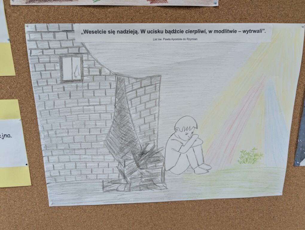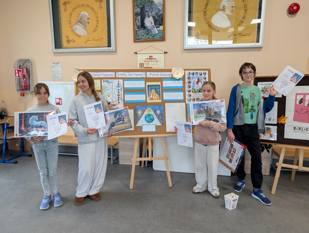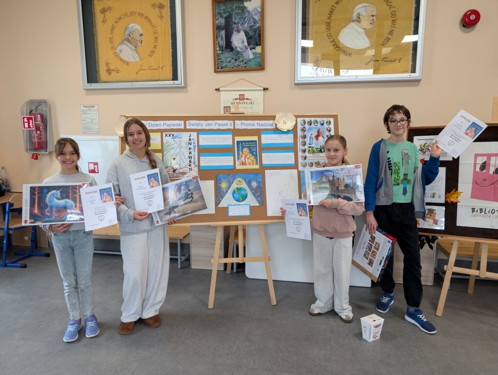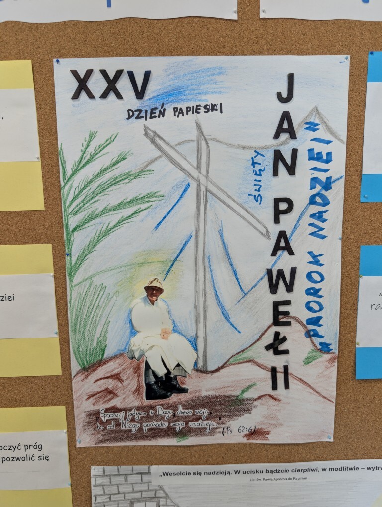 „Święty Jan Paweł II- Prorok Nadziei” to hasło XXV Dnia Papieskiego, obchodzonego w całej Polsce i we wszystkich środowiskach polonijnych na całym świecie. Z tym hasłem związany był także nasz konkurs katechetyczny. Uczniowie wykonali plakaty z wykorzystaniem cytatów z biblii mówiących o nadziei, o której nasz Patron mówił, że jest ona głęboką postawą serca, siostrą wiary i miłości.