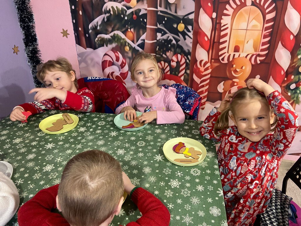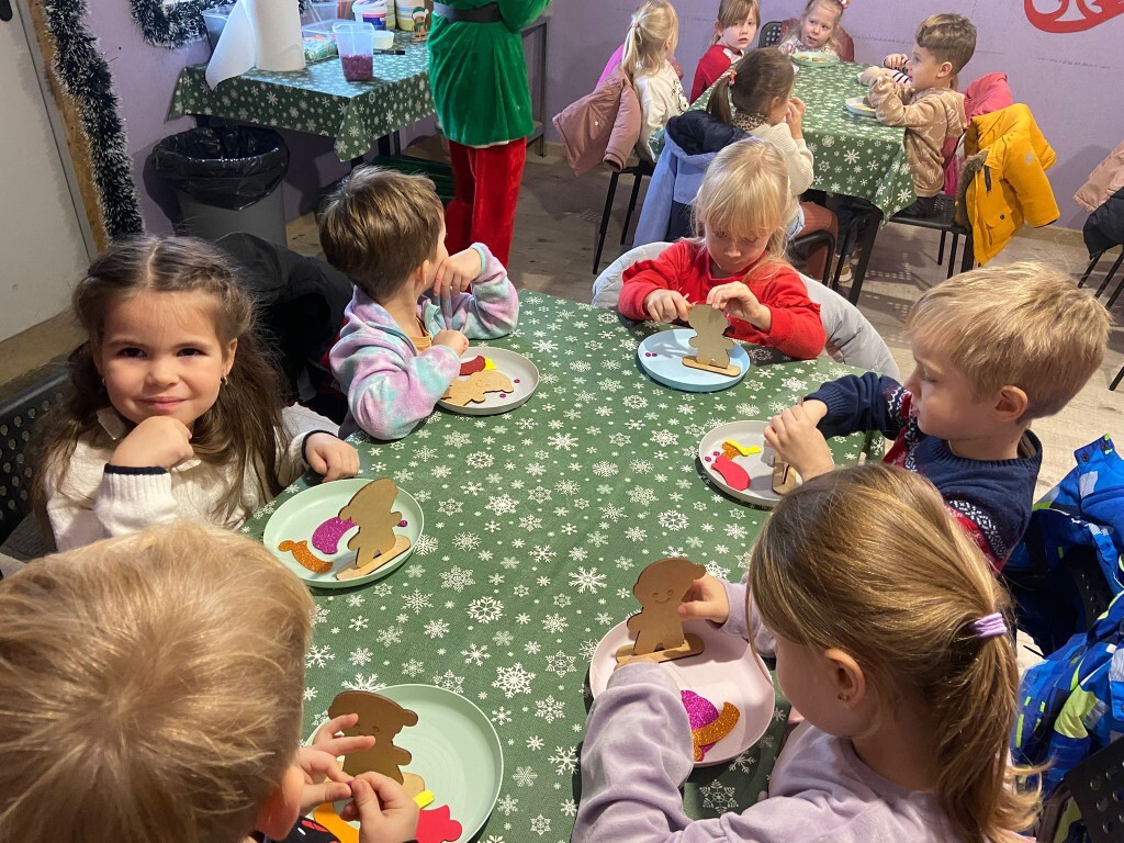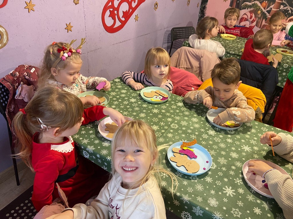 Na miejscu czekały na nas Elfy oraz wiele magicznych aktywności. Dzieci z ogromnym zaangażowaniem dekorowały pierniczki, rozwijając swoją kreatywność i zdolności manualne. Następnie brały udział w tworzeniu dekoracji świątecznych.