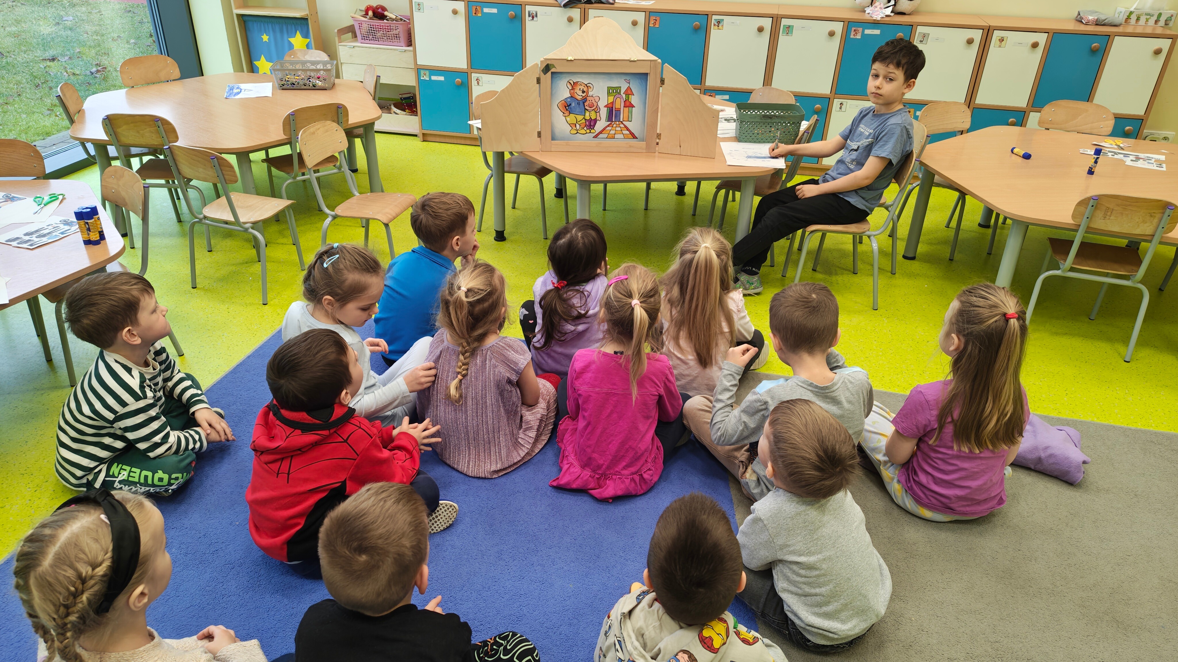 Ferie to w naszym przedszkolu czas wyjątkowych spotkań i integracji!W ostatnich dniach grupy Pszczółek i Misiów oraz Odkrywców i Pingwinów spotkały się na wspólnym „czytaniu na dywanie”. Tym razem jednak bajki nie tylko słuchaliśmy, ale i oglądaliśmy dzięki niezwykłemu teatrzykowi Kamishibai.