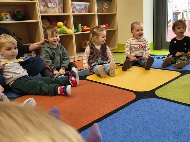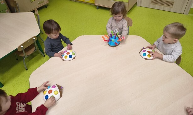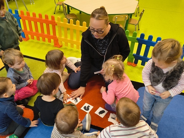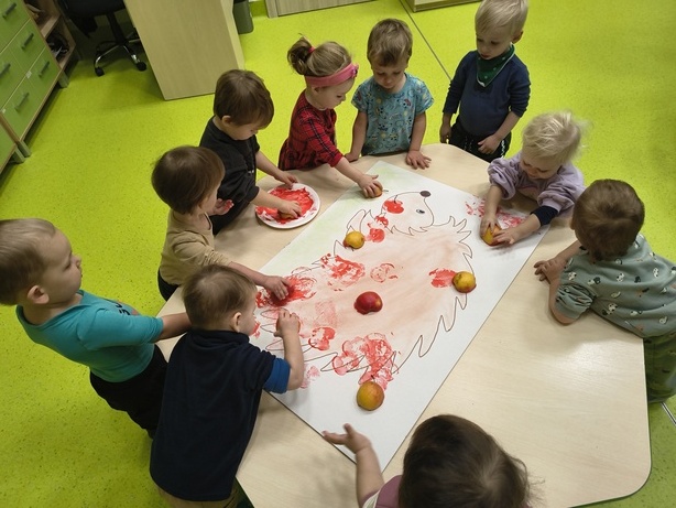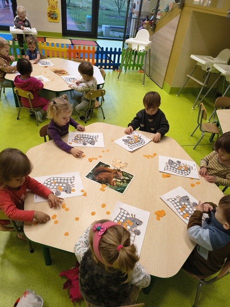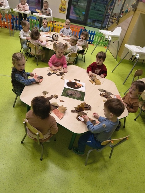 W tym tygodniu małe Kotki poznawały leśne zwierzęta. Świetnie radziły sobie łącząc w pary zwierzęta z ich cieniem. Podczas zajęć stworzyły za pomocą jabłek i farby piękne pieczątki na wielkim jeżu. Każde dziecko zrobiło również jeżyka z pomocą taśmy i liści. Deszczowy dzień umilały nam tematyczne piosenki i zabawki. Mało tego odwiedziliśmy żłobkową salę zabaw i szukaliśmy jeżyka na magicznym dywanie. Podczas tego tygodnia dzieci również nakarmiły orzechami kartonową wiewiórkę. Zrobiły pracę plastyczną wyklejając kolorowymi kartkami wiewiórki.