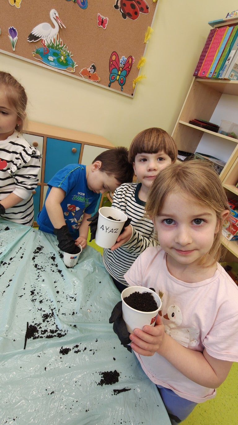 z wielkim zaangażowaniem przystąpiły do pracy. Każde dziecko samodzielnie nakładało ziemię do podpisanych swoim imieniem kubeczków. W tak przygotowanej ziemi dzieci robiły małe wgłębienia, w których ostrożnie umieszczały nasiona fasoli szparagowej. Na koniec nasionka zostały przykryte warstwą ziemi i podlane, by mogły zacząć kiełkować. Po posadzeniu nasion nadszedł najtrudniejszy, ale i najbardziej intrygujący moment – czekanie. Dzieci codziennie zaglądały do swoich kubeczków, obserwując wilgotność ziemi i wypatrując pierwszych zielonych listków. Był to czas nauki o tym, czego rośliny potrzebują do życia: światła, wody i odpowiedniej temperatury. Po powrocie z przerwy świątecznej na dzieci czekała niesamowita niespodzianka. Większość fasolek wystrzeliła wysoko w górę! Dzieci