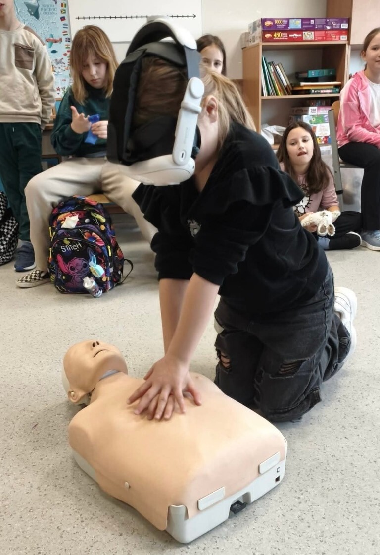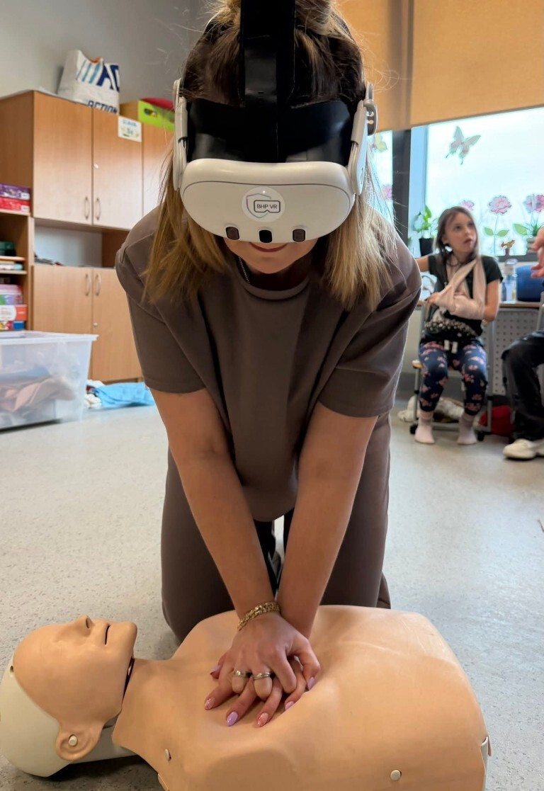 Największym doświadczeniem dla uczniów było wykorzystanie okularów VR do udzielenia I pomocy przedmedycznej i przeniesienie się w prawdziwe zdarzenie z wykorzystaniem zebranych wiadomości.