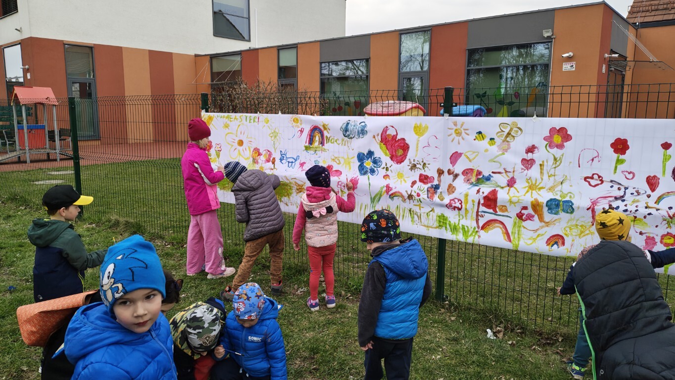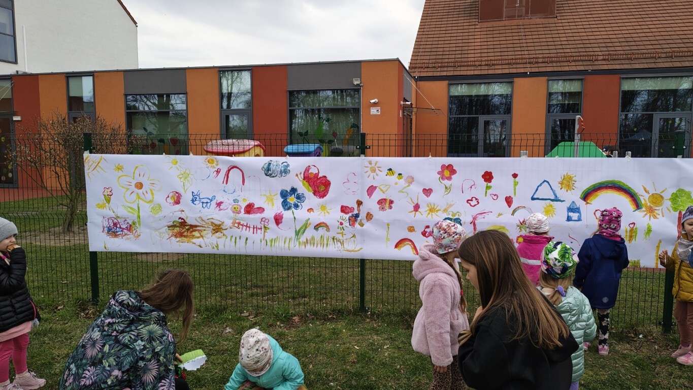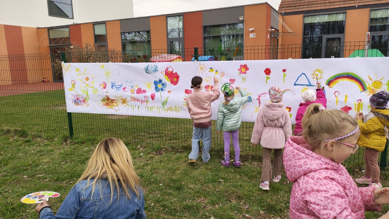 Artystyczny Płot: Dzieci wspólnie malowały farbami gigantyczną, wiosenną łąkę na ogrodzeniu przedszkola.