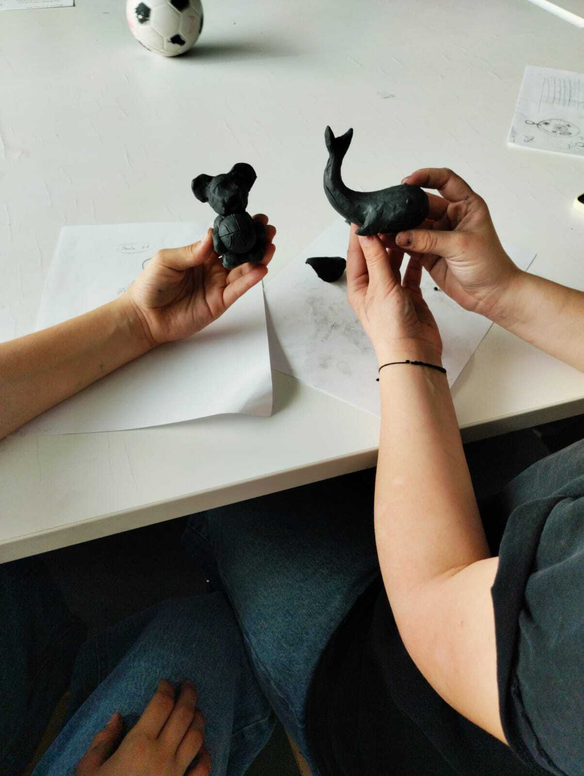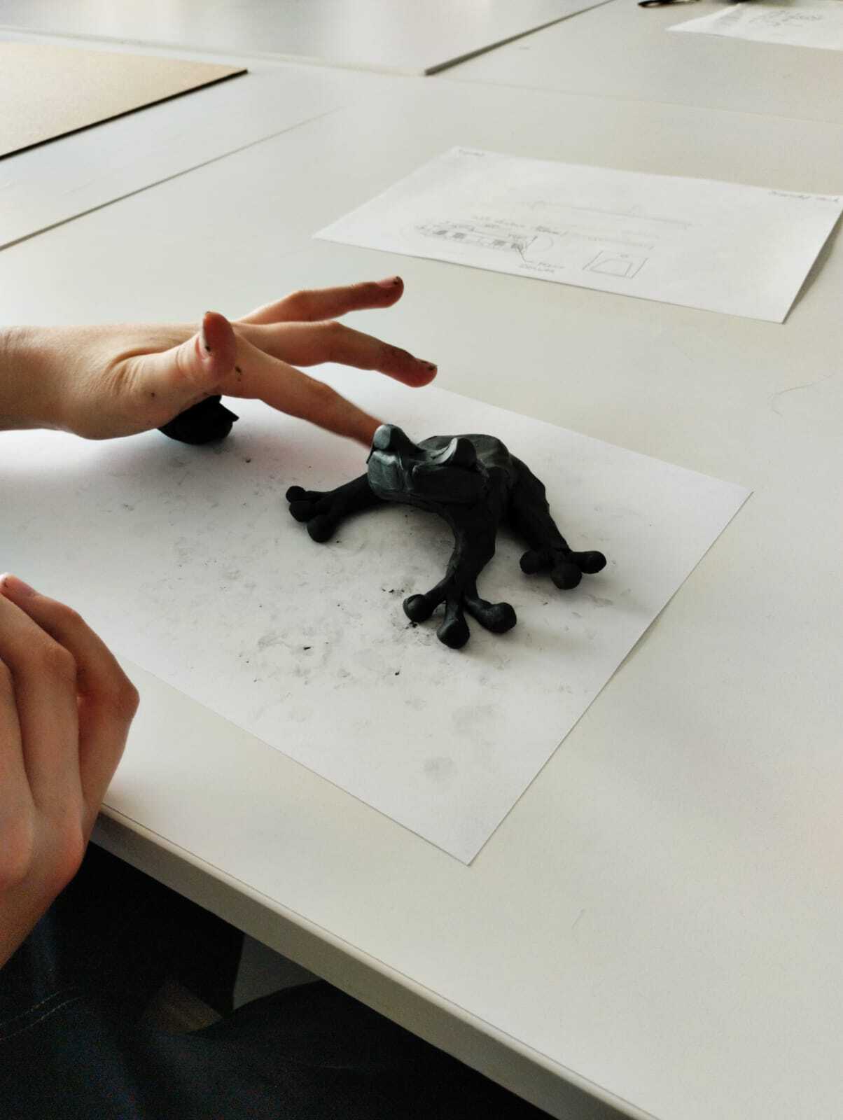 Zajęcia rozpoczęły się od podzielenia uczniów na grupy i wprowadzenia teoretycznego, podczas którego omówiono właściwości materiałów ceramicznych, etapy procesu technologicznego oraz zasady pracy w pracowni. Następnie uczestnicy mieli okazję przejść do części praktycznej, obejmującej ręczne formowanie gliny. Tematyką pracy ceramicznych było funkcjonalne podejście do opieki nad zwierzętami i dlatego uczniowie zaprojektowali przedmiot użytkowy inspirowany zwierzęciem – miska dla psa.