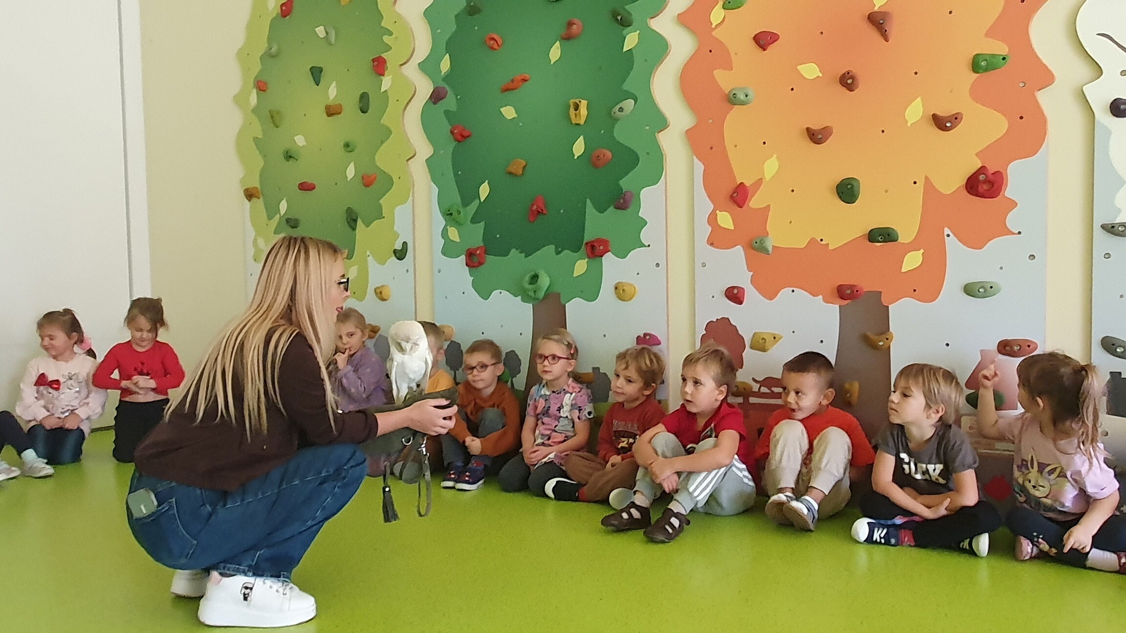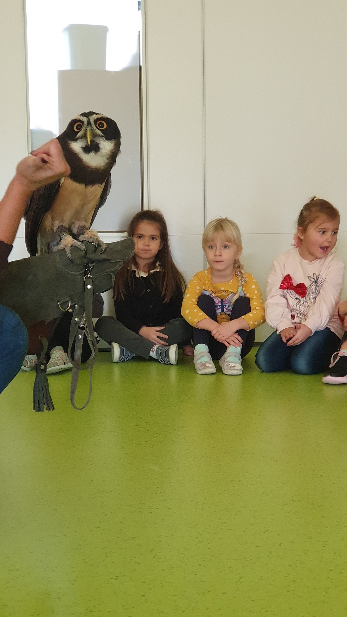 Podczas zajęć przedszkolaki miały okazję poznać 3 gatunki sów: płomykówkę , puszczyka, sowy z Meksyku. Dzieci mogły dotknąć piór sowy i posłuchać jaki odgłos wydają, zobaczyć jakie mają szpony, dowiedzieć się czym się żywią i że są bardzo aktywne nocą.