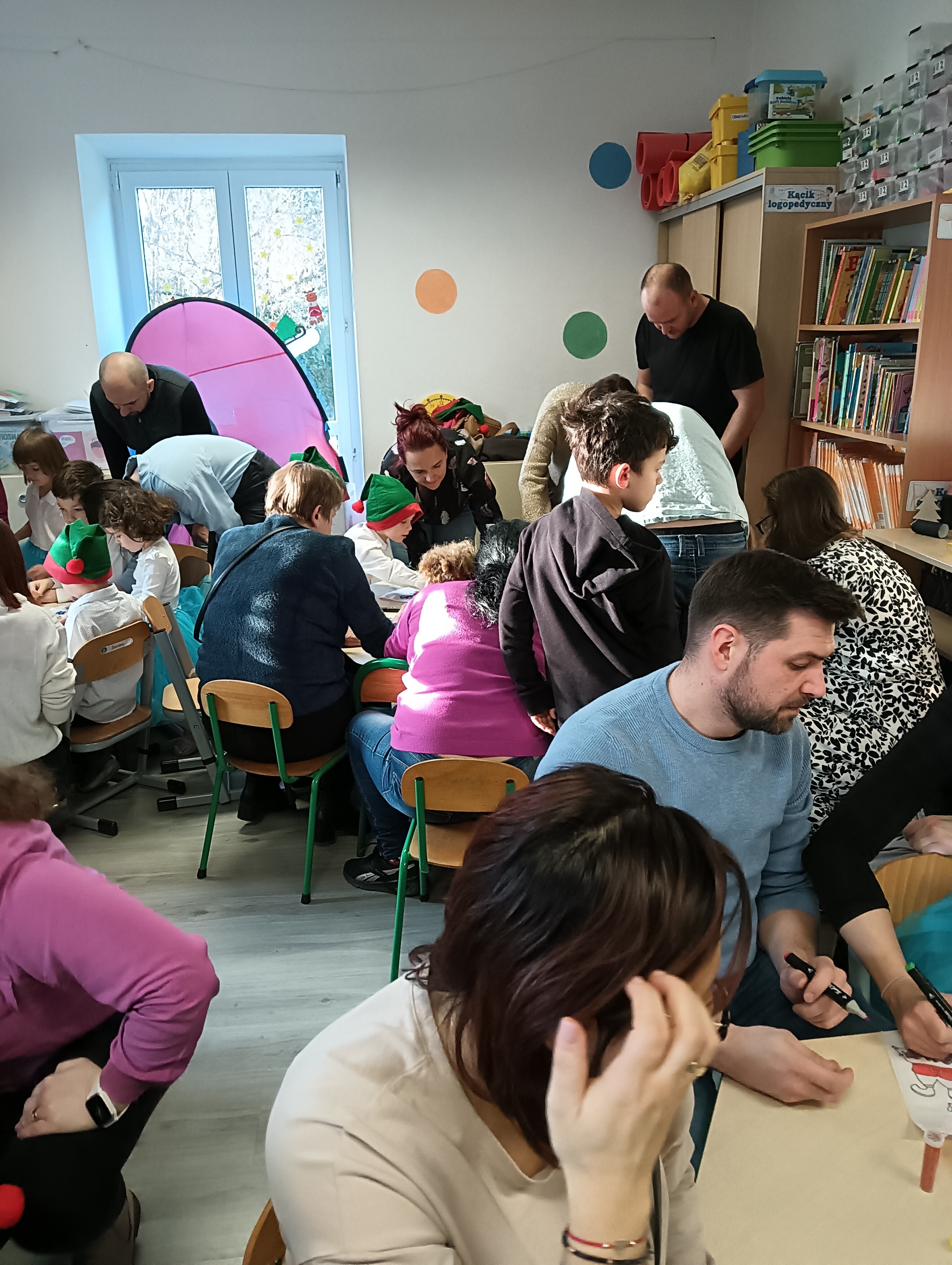 W dniu 17 grudnia w grupie Pingwiny odbyło się wyjątkowe spotkanie świąteczne warsztaty świąteczne z udziałem Rodziców. Nasze przedszkolaki z dumą otworzyły wydarzenie występem artystycznym, prezentując przygotowany z sercem program o tematyce bożonarodzeniowej. Po części artystycznej przyszedł czas na wspólną zabawę. Gry integracyjne nie tylko wywołały mnóstwo uśmiechów, ale przed wszystkim pozwoliły budować bliskie relacje i poczuć radosną atmosferę zbliżających się świąt. W dalszej części spotkania sala zamieniła się w prawdziwą pracownię artystyczną – dzieci wraz z rodzicami wspólnie tworzyły przepiękne ozdoby świąteczne. Była to doskonała okazja do rozwijania kreatywności i spędzania czasu w ciepłej, rodzinnej atmosferze. Dziękujemy wszystkim za wspólną radość i zaangażowanie.