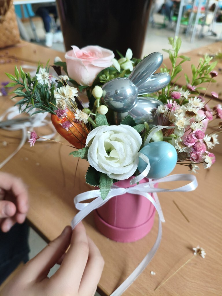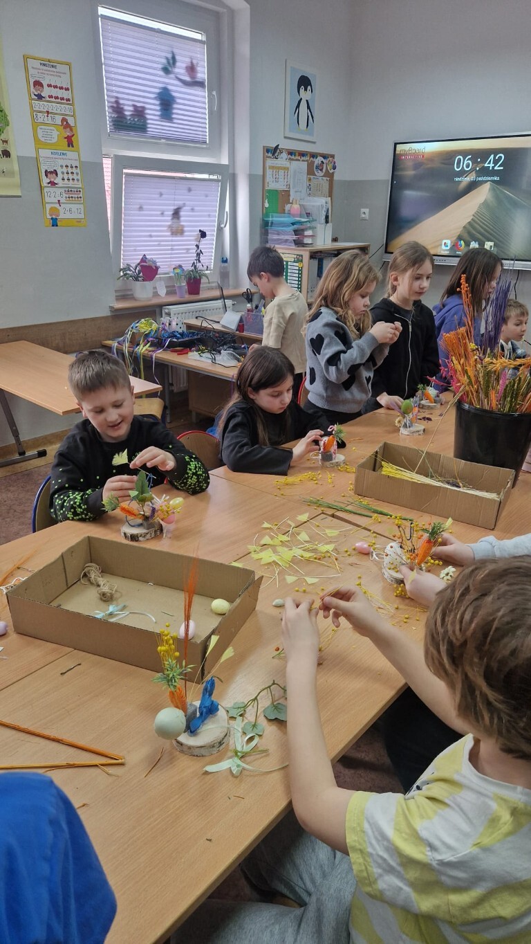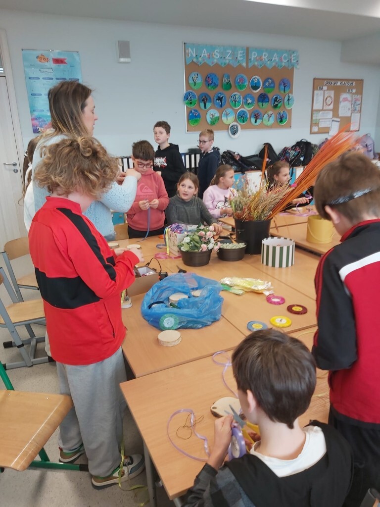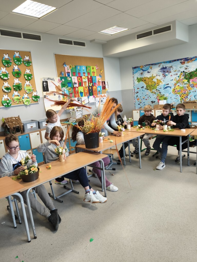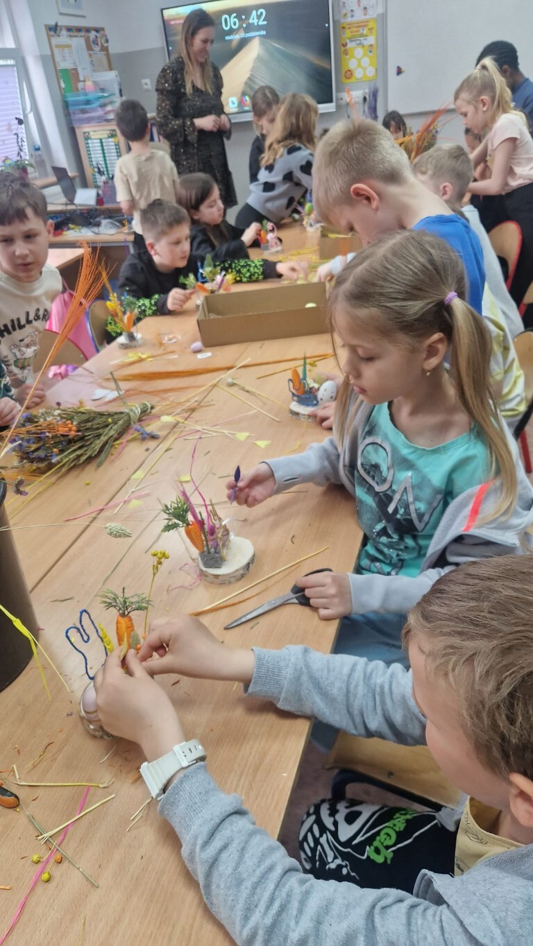 Uczniowie klas 1 - 3 brali udział w warsztatach kreatywnych, tworząc kompozycje florystyczne z motywem wielkanocno-wiosennym. Zajęcia edukacyjne i plastyczne, miały na celu przybliżenie tradycji świąt wielkanocnych oraz powitania wiosny. Była to doskonała okazja do rozwijania zdolności manualnych, wyobraźni oraz spędzenia czasu w twórczej atmosferze.