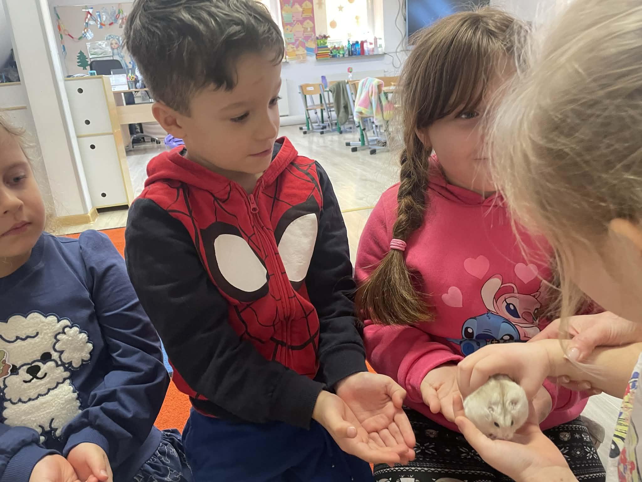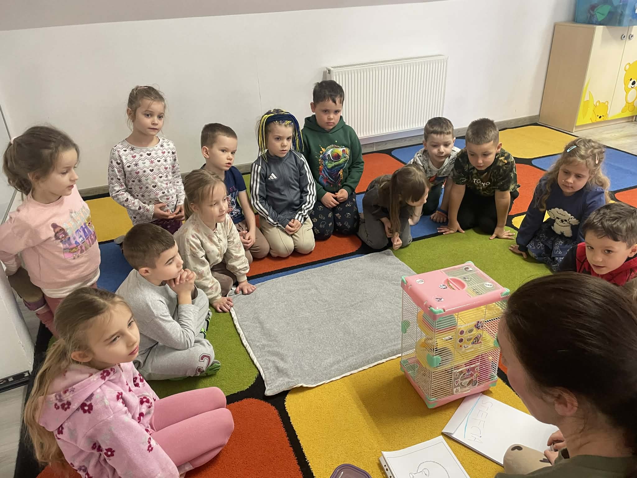 W naszej sali odbyła się wyjątkowa wizyta. Mama Stefani przyniosła do przedszkola chomika i opowiadał dzieciom o jego zwyczajach, sposobie odżywiania oraz o tym, jak należy się nim opiekować. Dzieci z dużym zainteresowaniem słuchały opowieści, zadawały pytania i miały okazję z bliska zobaczyć chomika. Było to bardzo ciekawe i radosne spotkanie.