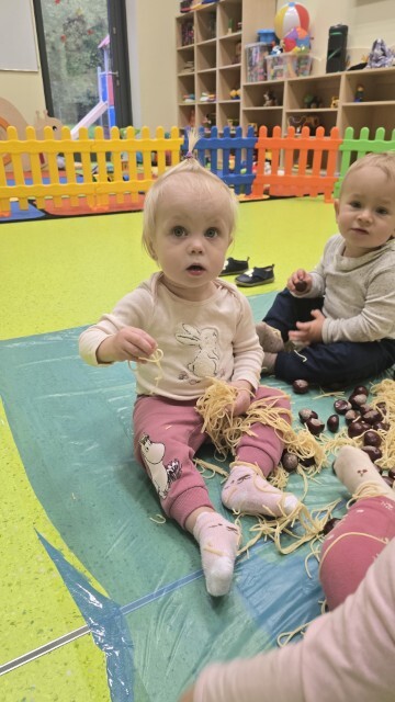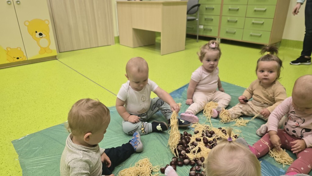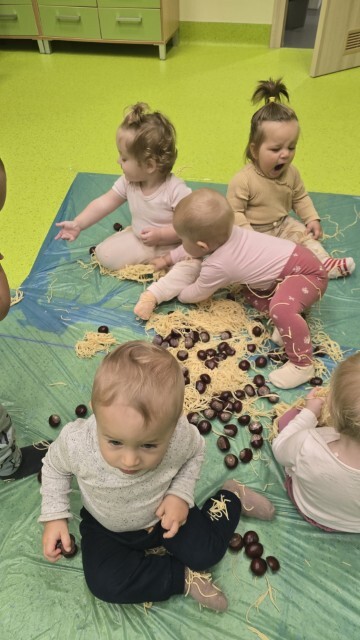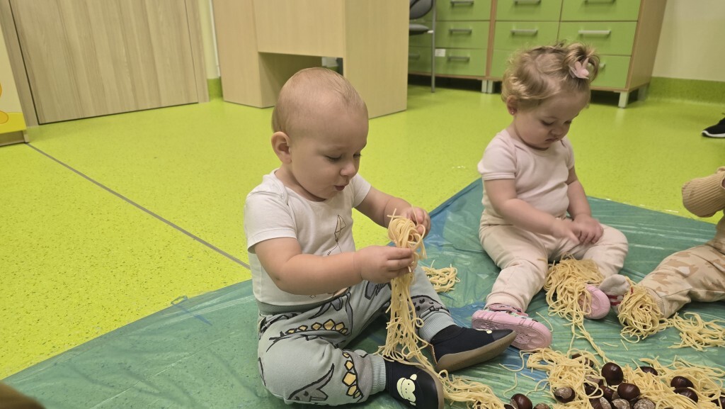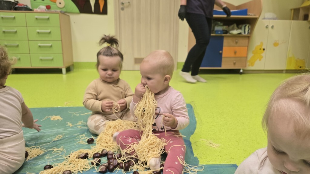 Z wielkim zaciekawieniem i zaangażowaniem dotykały, gniotły i smakowały makaron. Wyszukiwały ukryte w nim skarby -jesienne kasztany.