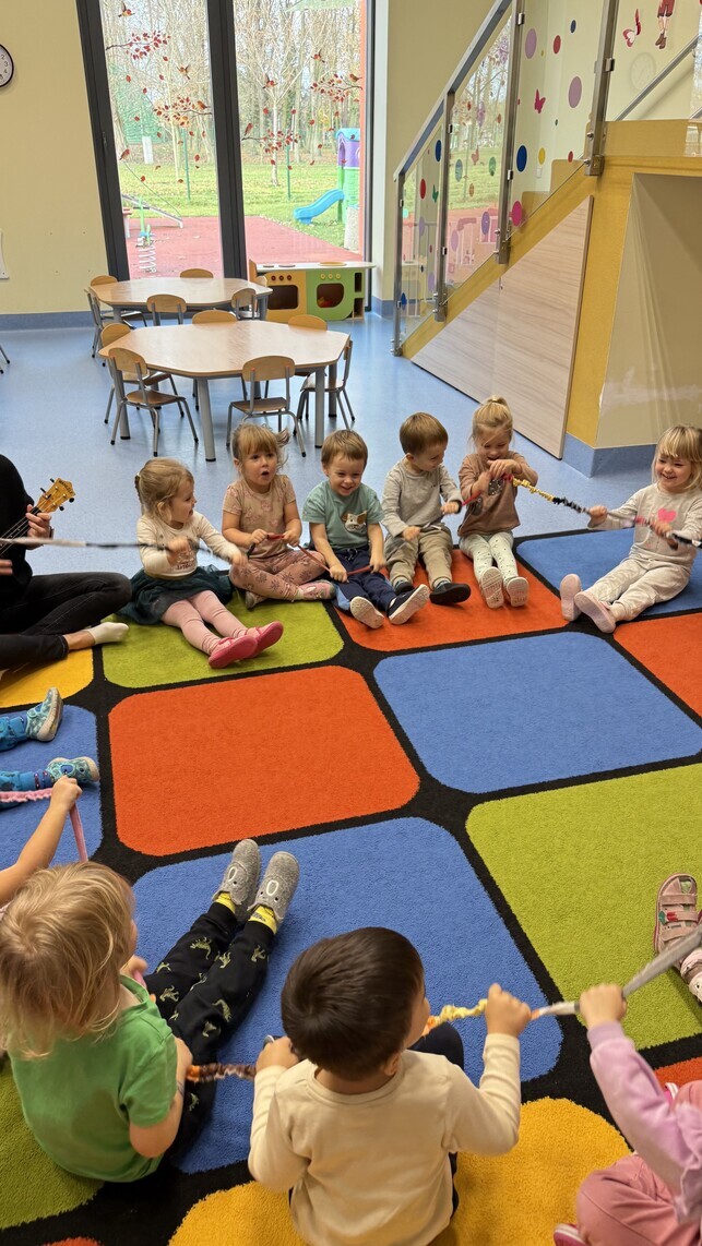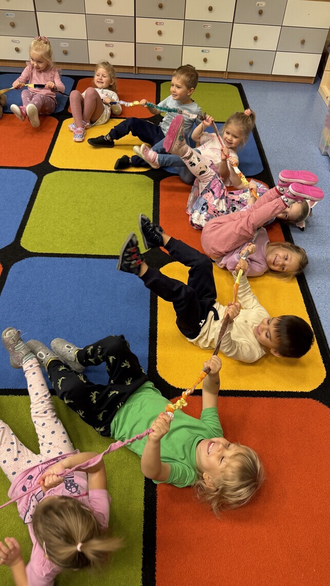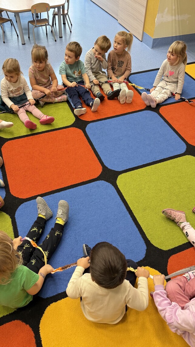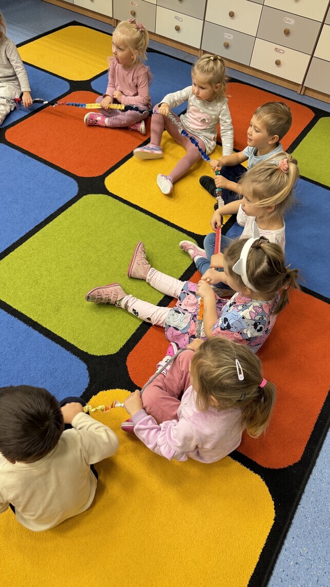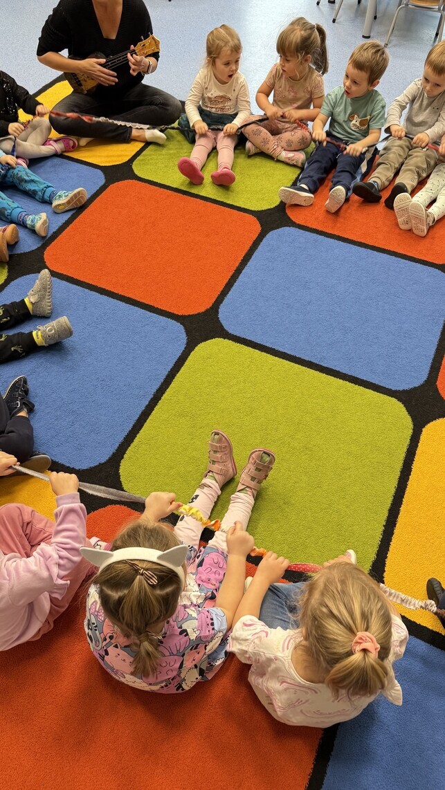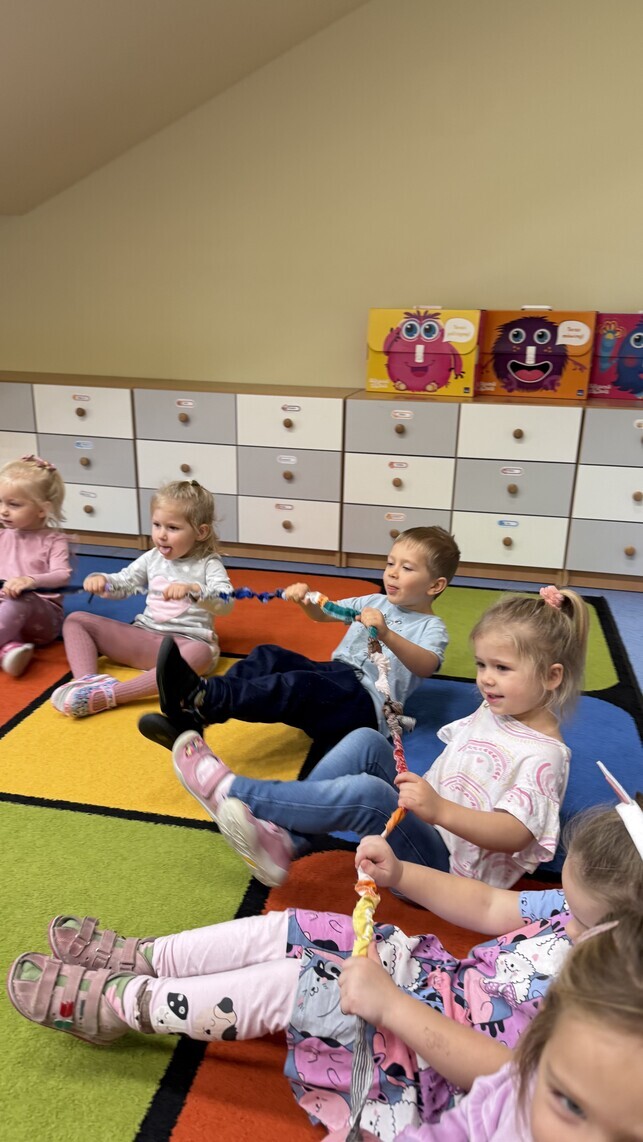 Podczas dzisiejszych zajęć rytmicznych Pszczółki z zaangażowaniem uczyły się nowej piosenki. Dzieci śpiewały, klaskały i próbowały łączyć ruch z muzyką. Było dużo radości, energii i świetnej zabawy!