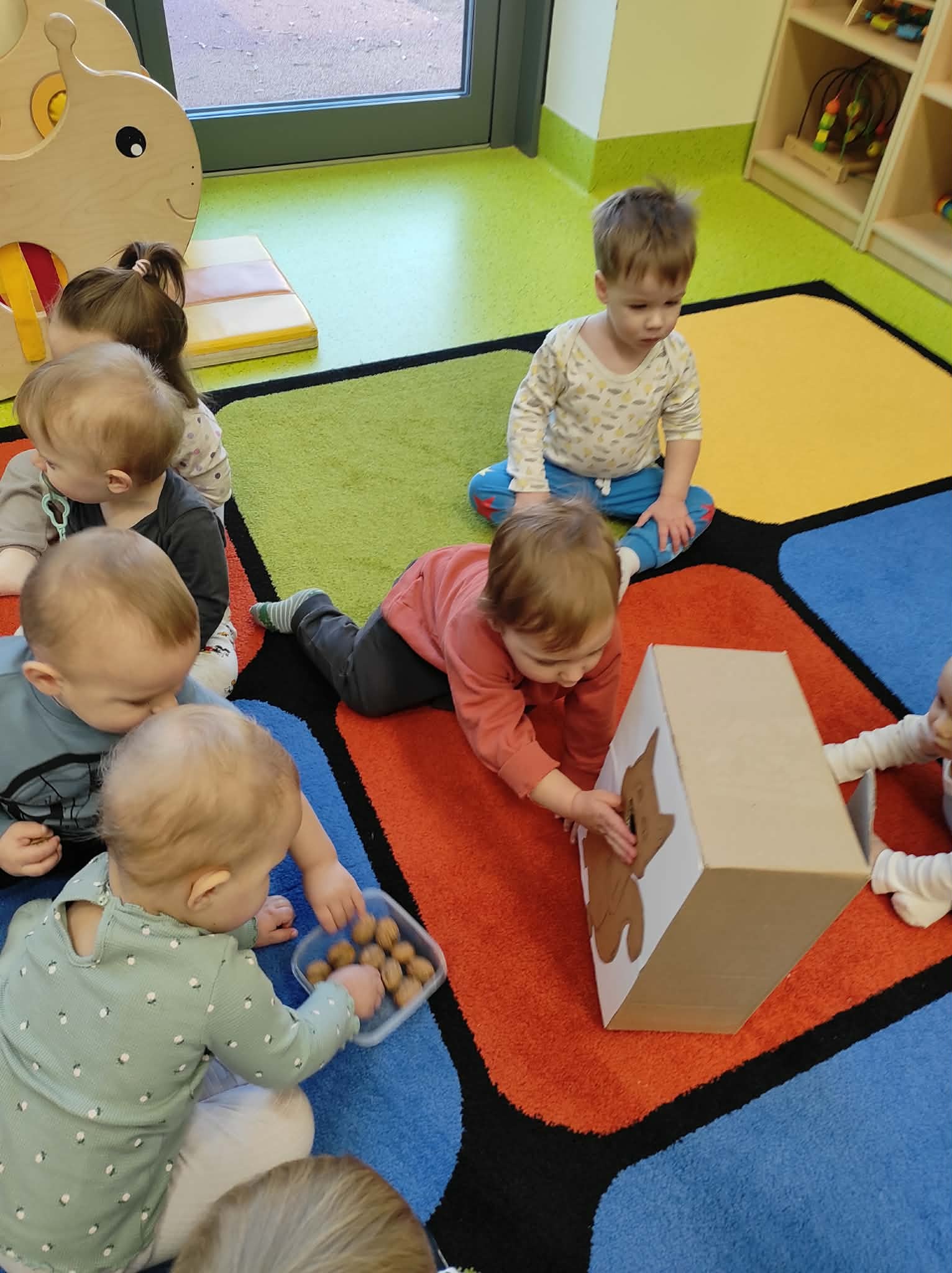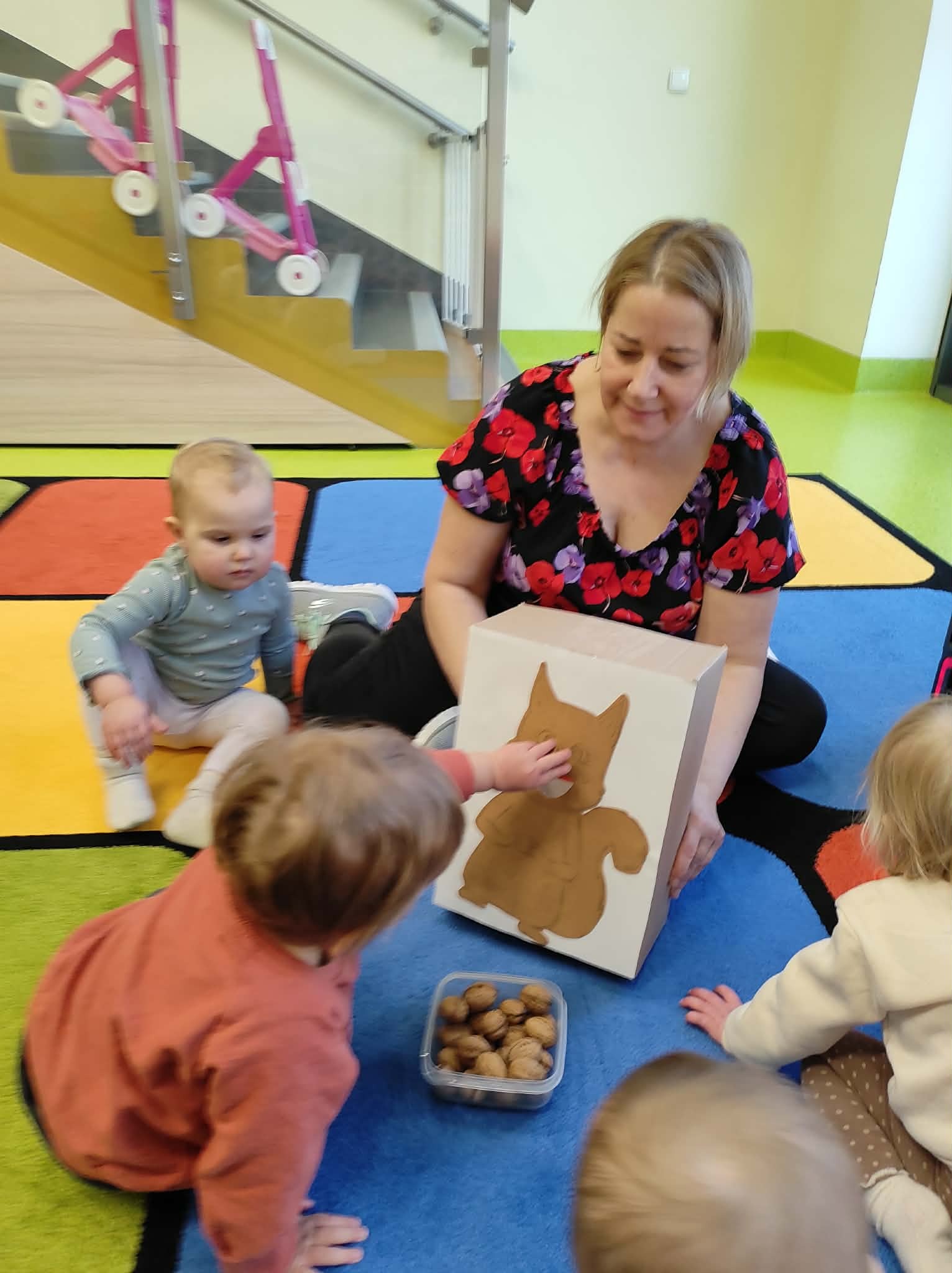 Dużo radości sprawiło dzieciom karmienie orzechami wykonanej z kartonu wiewiórki.