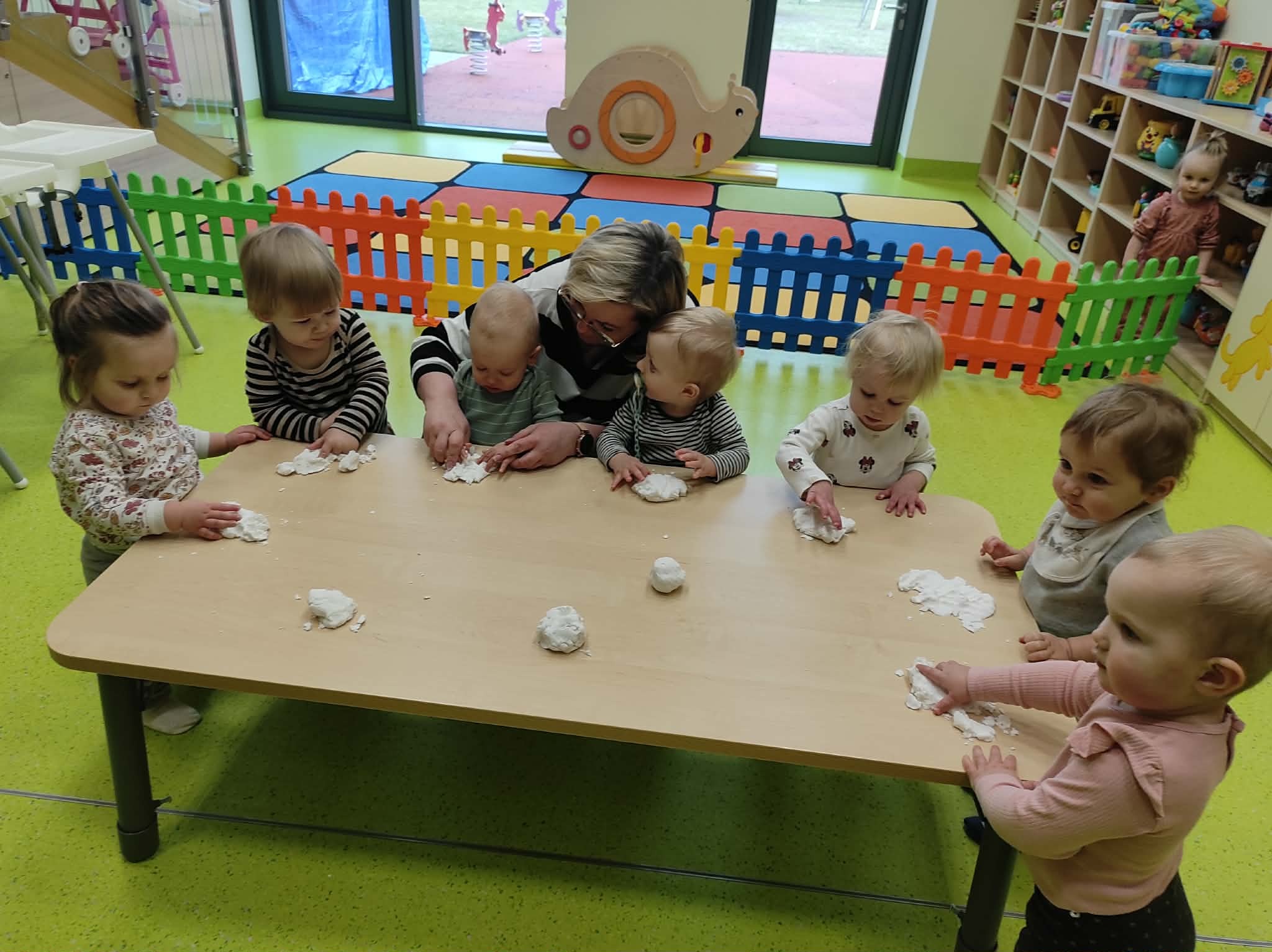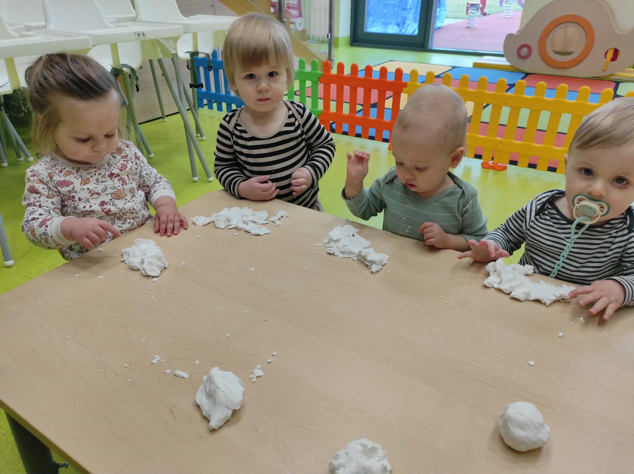 Podczas zajęć sensorycznych bawiliśmy się przygotowanym z mąki ziemniaczanej sztucznym śniegiem- ćwiczenia takie jak ugniatanie, mieszanie i formowanie masy wzmacnia dłonie, stymuluje zmysły oraz rozwija wyobraźnię.