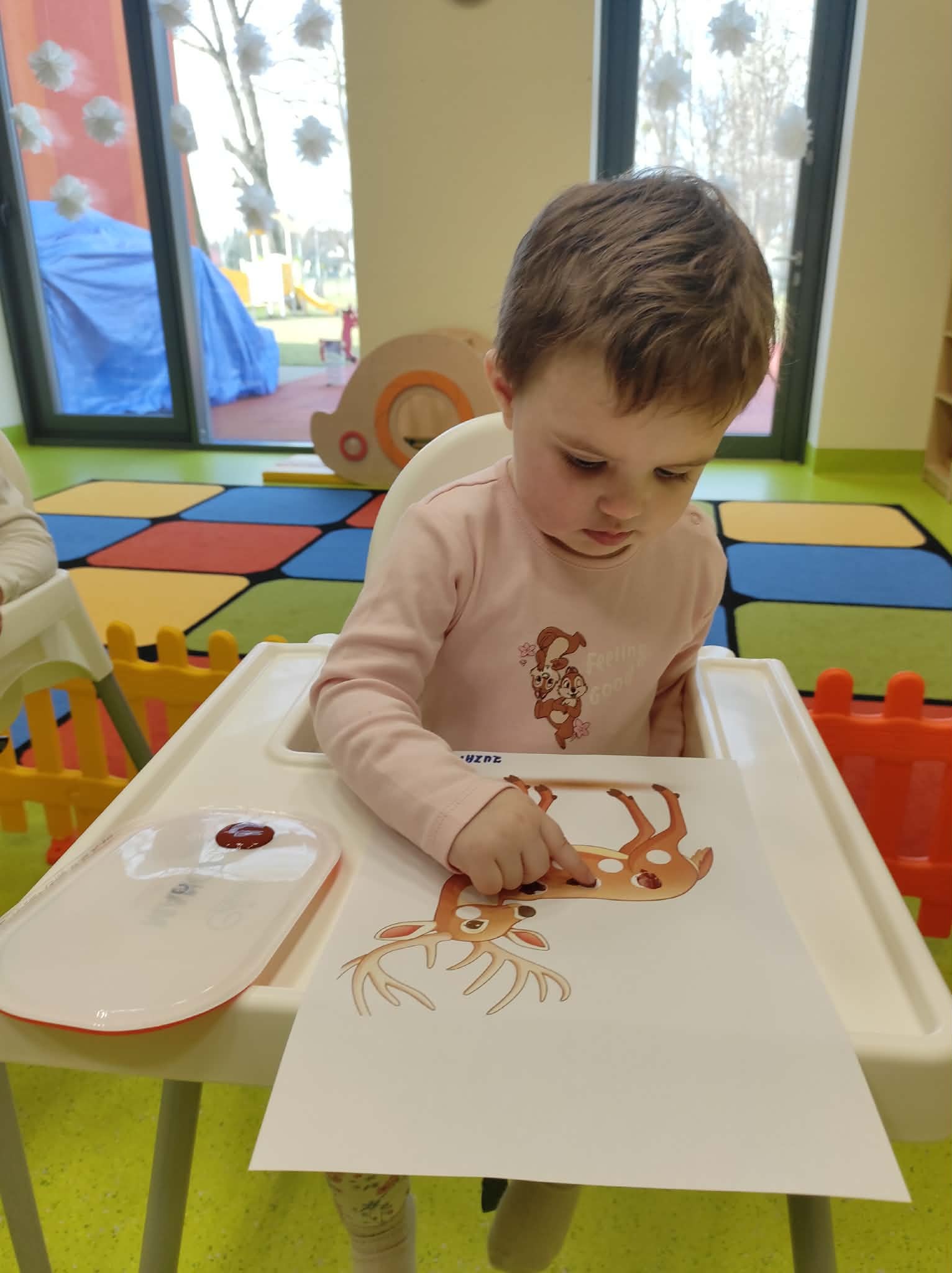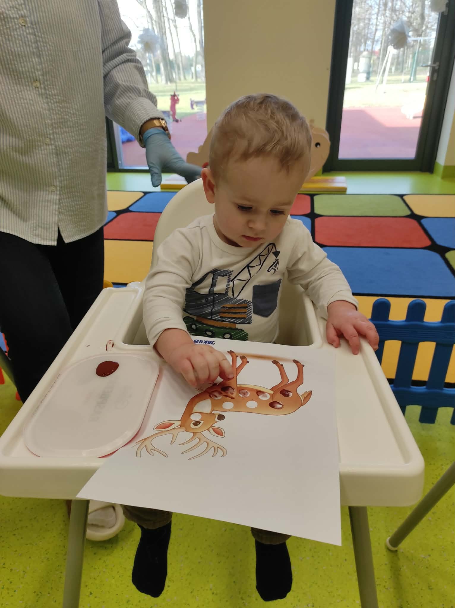 Podczas zajęć plastycznych maluszki starały się wypełnić farbą puste pola na sylwecie jelonka.
